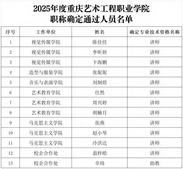 附件:2025年度重庆艺术工程职业学院高校教师系列职称确定通过人员名单