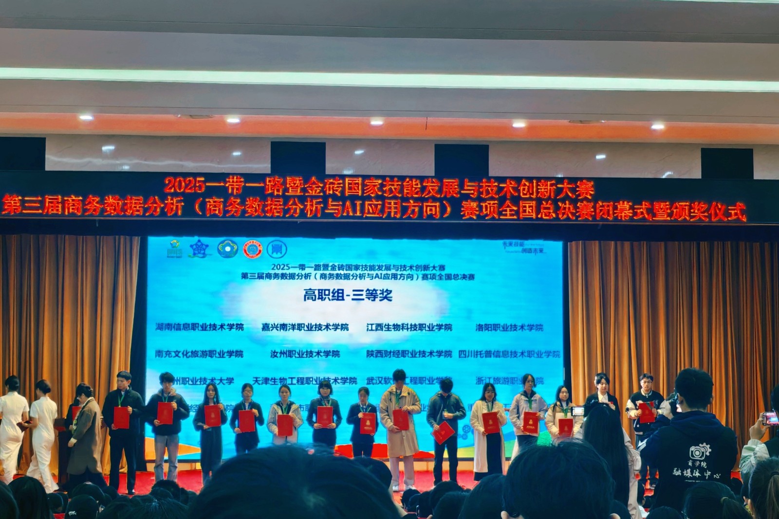 2025年10月26日,2025“一带一路”暨金砖国家技能发展与技术创新大赛之第三届商务数据分析(商务数据分析与AI应用方向)赛项全国总决赛在山东落下帷幕。我校数字经济学院“双带头人”党支部充分发挥战斗堡垒作用,引领师生团队奋勇拼搏,最终荣获全国总决赛三等奖,以实际行动践行“以赛促教、以赛促学”育人理念。