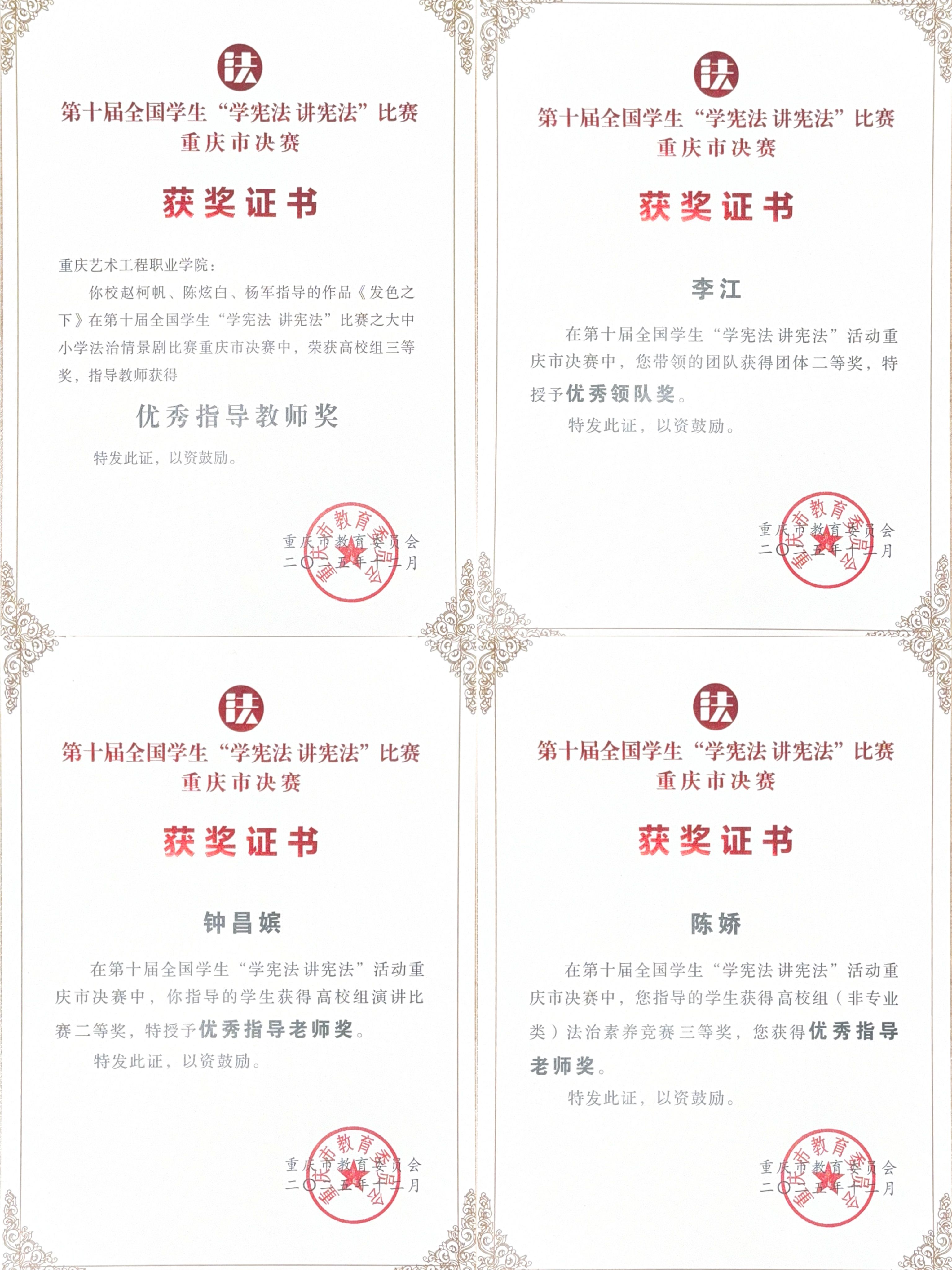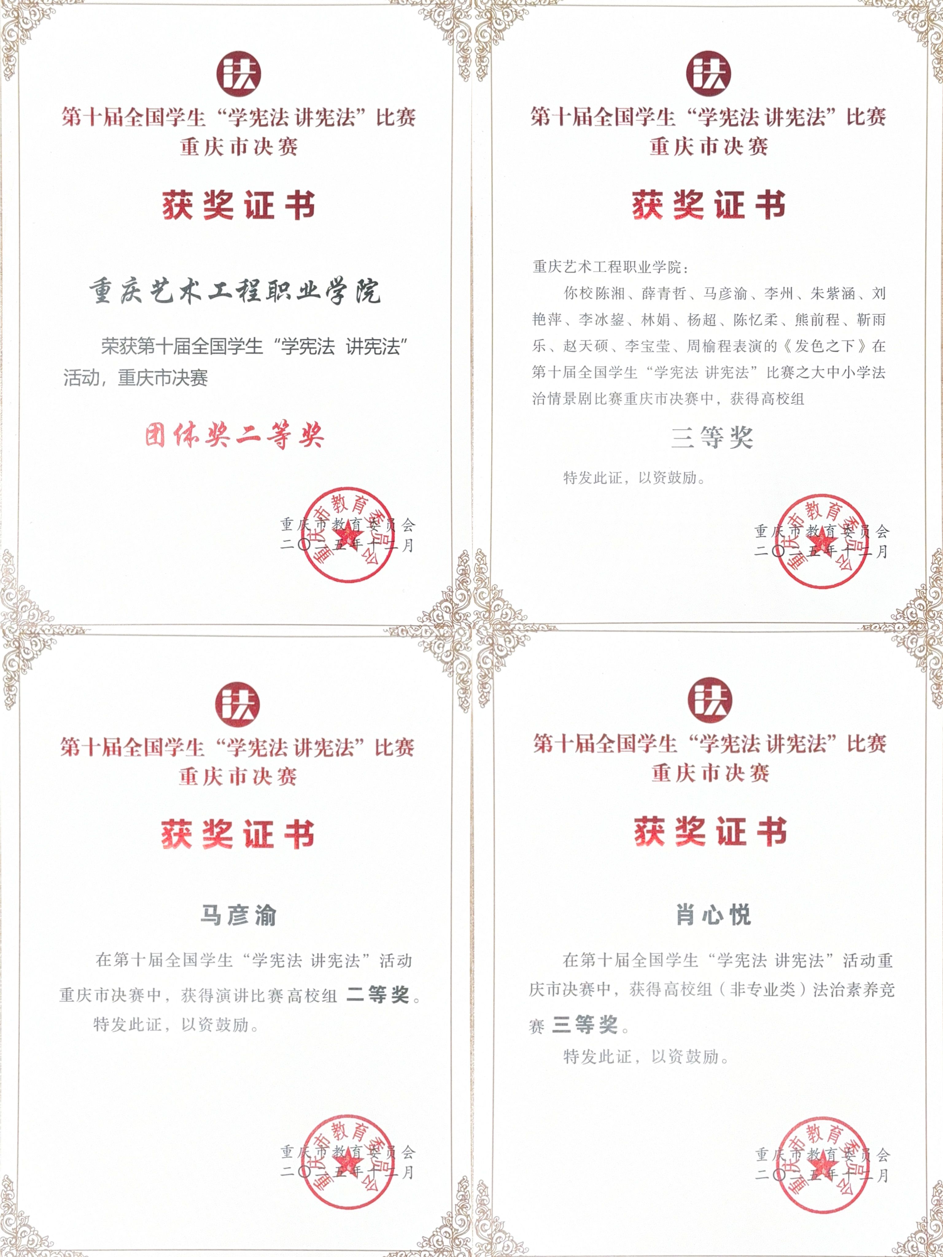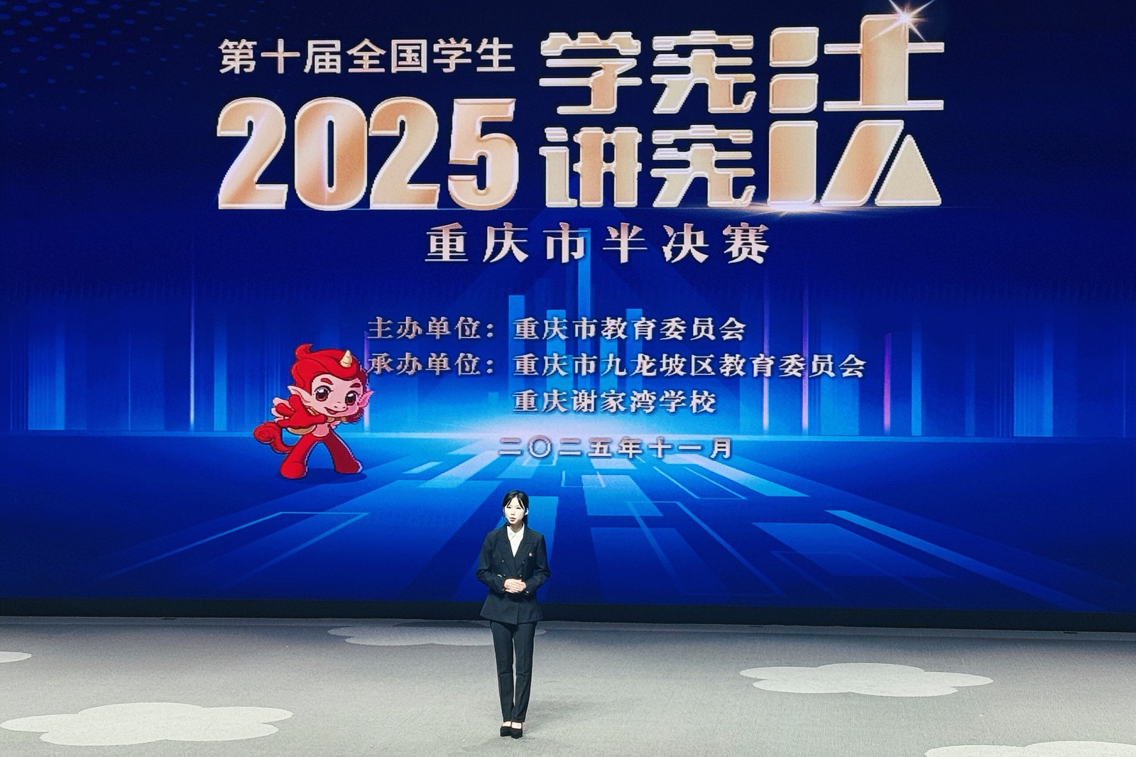 2025年11月22日至23日,第十届全国学生“学宪法讲宪法”活动重庆市决赛在重庆谢家湾学校举行,我校数字经济学院2024级工程造价1班专业学生马彦渝同学凭借出色表现,荣获演讲比赛二等奖。