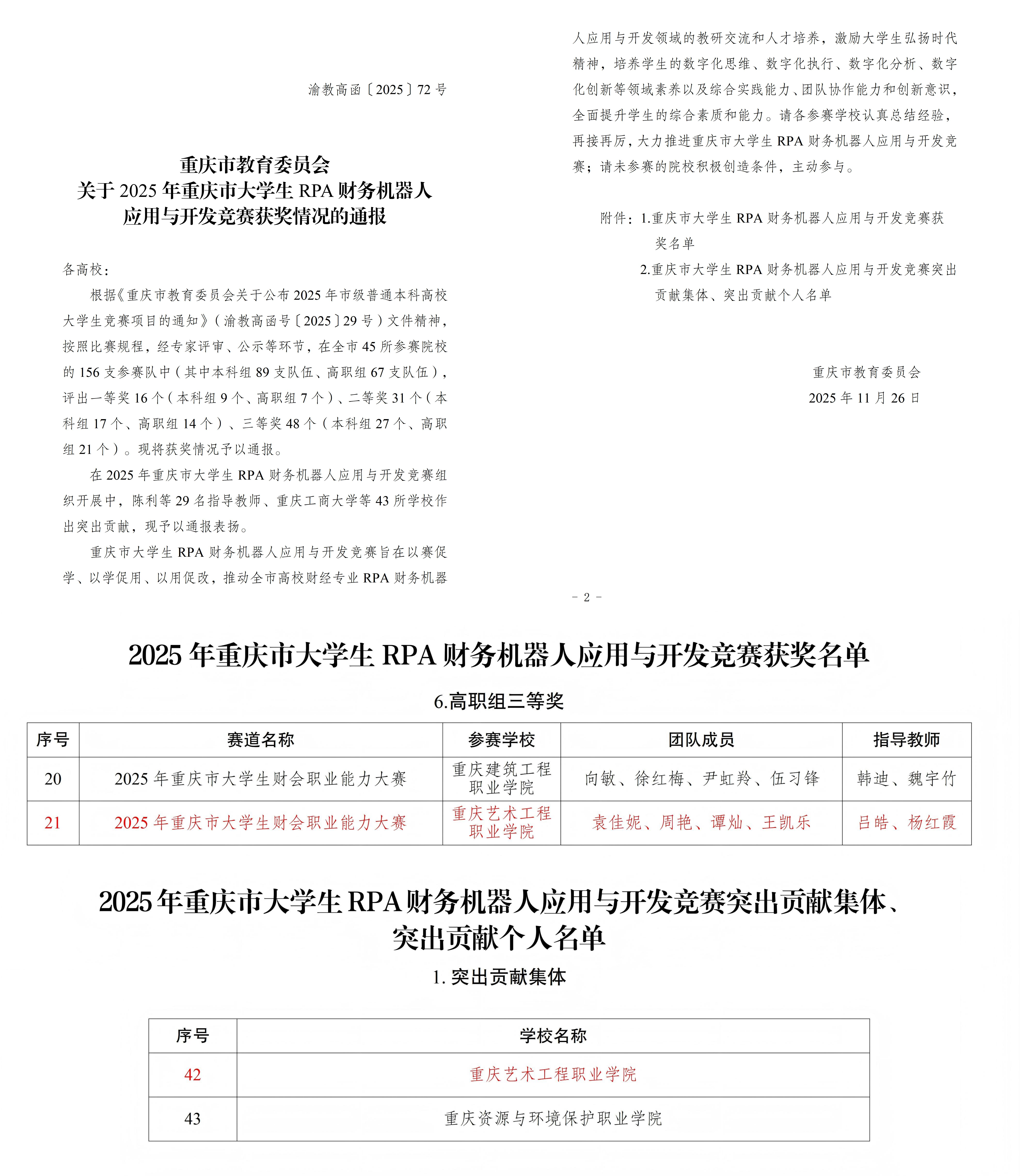 2025年11月26日,重庆市教育委员会发布了关于2025年重庆市大学生RPA财务机器人应用与开发竞赛获奖情况的通报。我校学生团队袁佳妮、周艳、谭灿、王凯乐,在吕皓、杨红霞两位老师的指导下,荣获高职组三等奖。同时,我校荣获“突出贡献集体”称号。