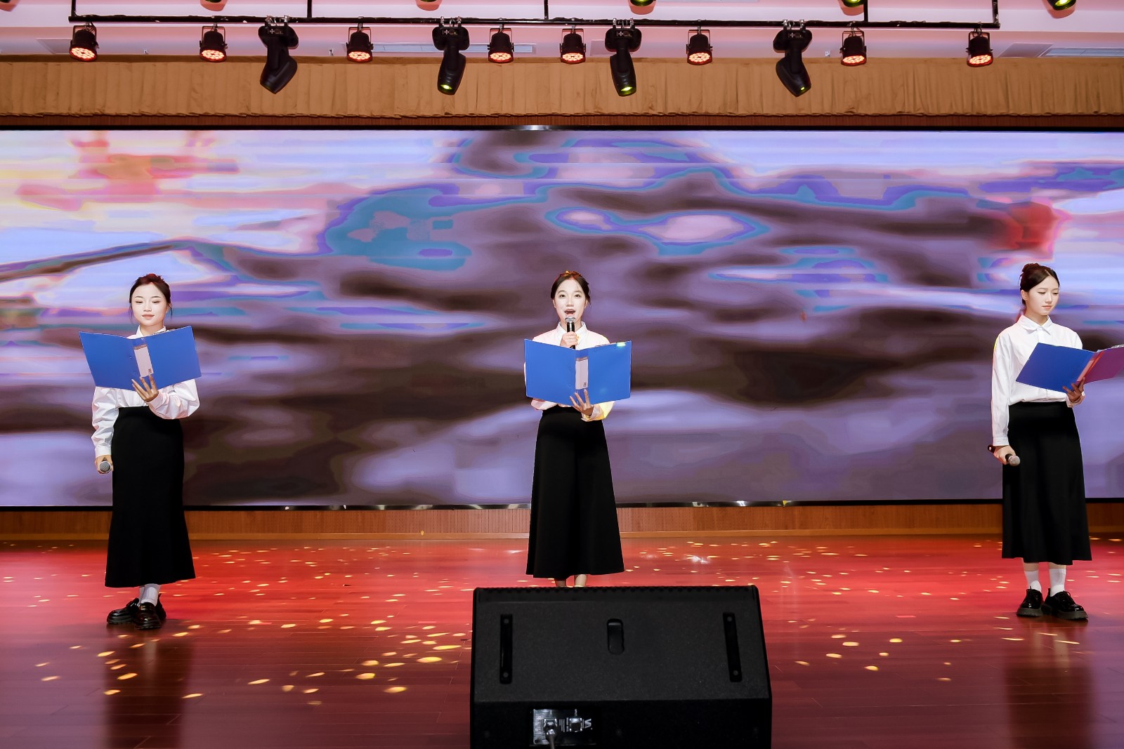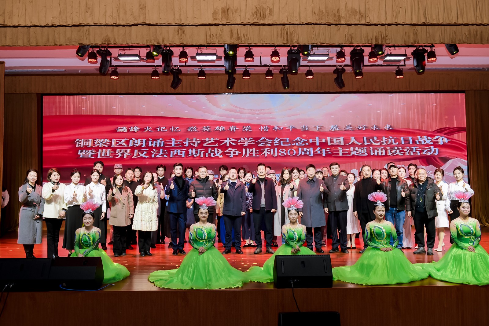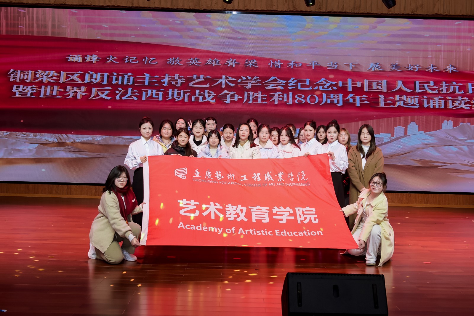 12月5日,由铜梁区文联主办、区朗诵主持艺术学会承办的"诵烽火记忆 敬英雄脊梁 惜和平当下 展美好未来"主题诵读活动在区老年大学演出大厅隆重举行。重庆艺术工程职业学院艺术教育学院作为协办单位,100多位学生参与,选派优秀学子为活动献上开场节目《烈火中的丰碑——邱少云烈士事迹诵》,以专业素养和饱满热情赢得现场观众热烈掌声。