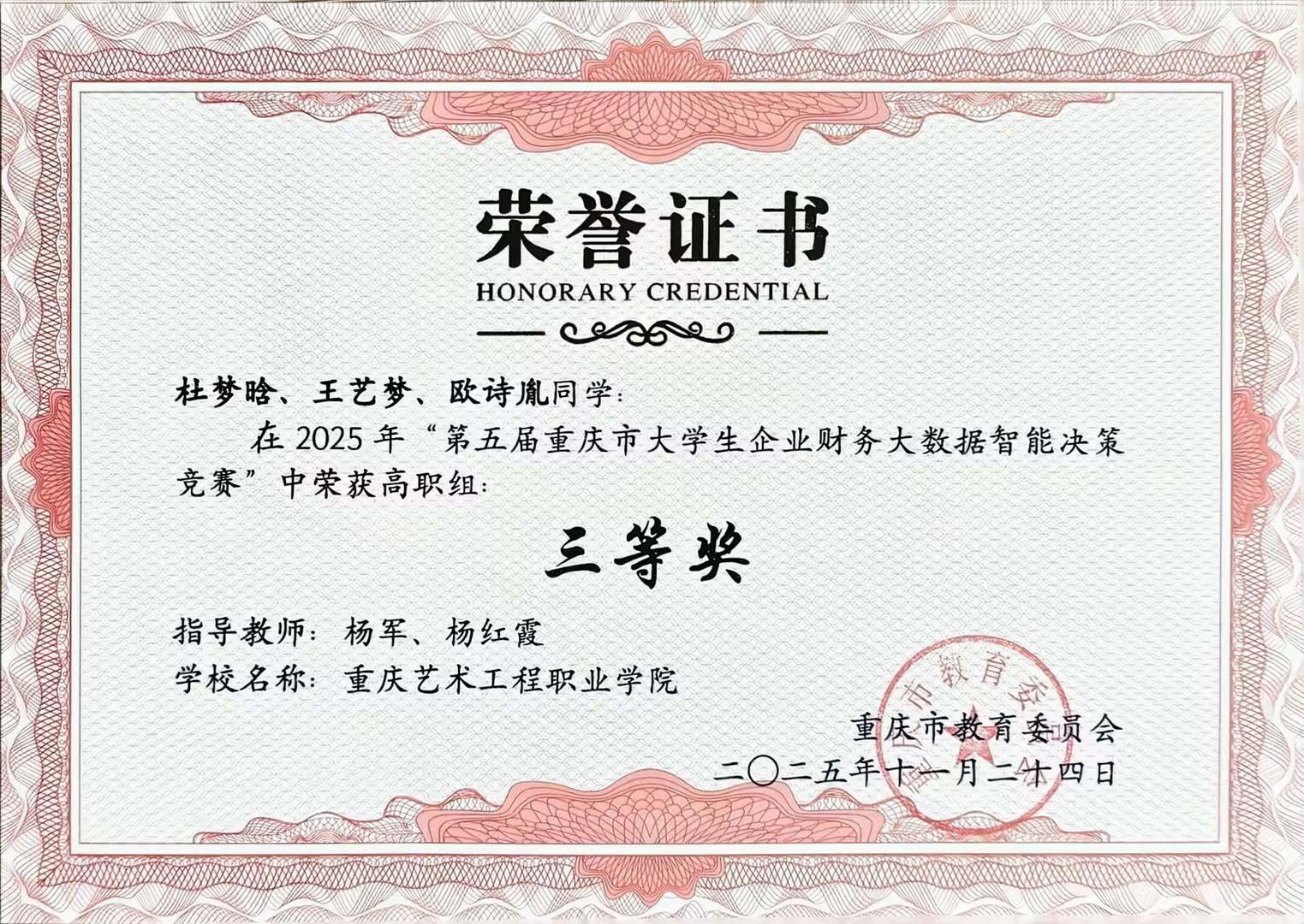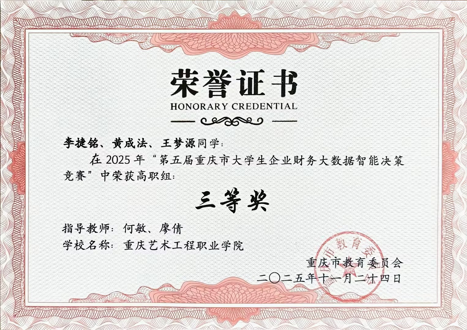 2025年12月4日,第五届重庆市大学生企业财务大数据智能决策竞赛获奖名单揭晓,我校数字经济学院大数据技术专业两支参赛队伍在全市37所院校103支队伍的激烈角逐中脱颖而出,成功斩获双项三等奖,以扎实的专业实力生动诠释了我校“以赛促学、以赛促教”的育人理念与实践成效。