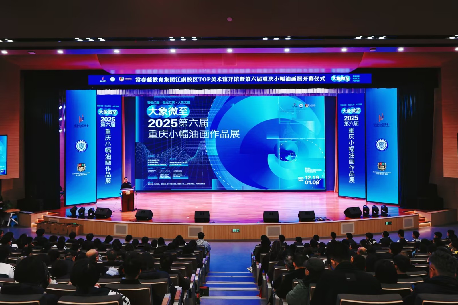 2025年12月19日,一场备受瞩目的艺术盛会在港鑫教育集团常春藤江南中学礼堂、美术馆盛大启幕。港鑫教育集团常春藤江南中学TOP美术馆盛大开馆并举办“大象微至 - 重庆2025第六届小幅油画作品展”。重庆艺术界与教育界的嘉宾齐聚这一重要时刻。