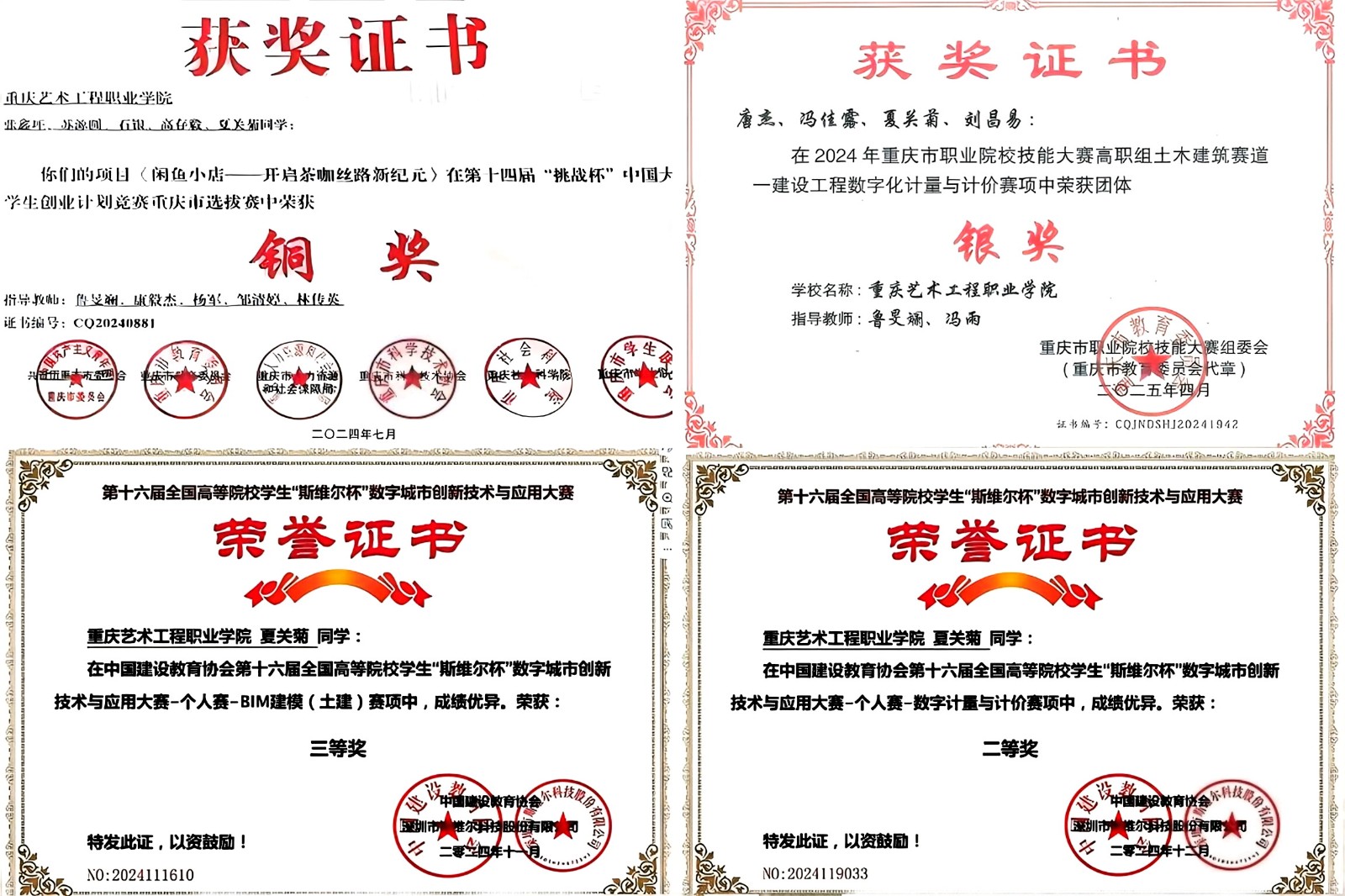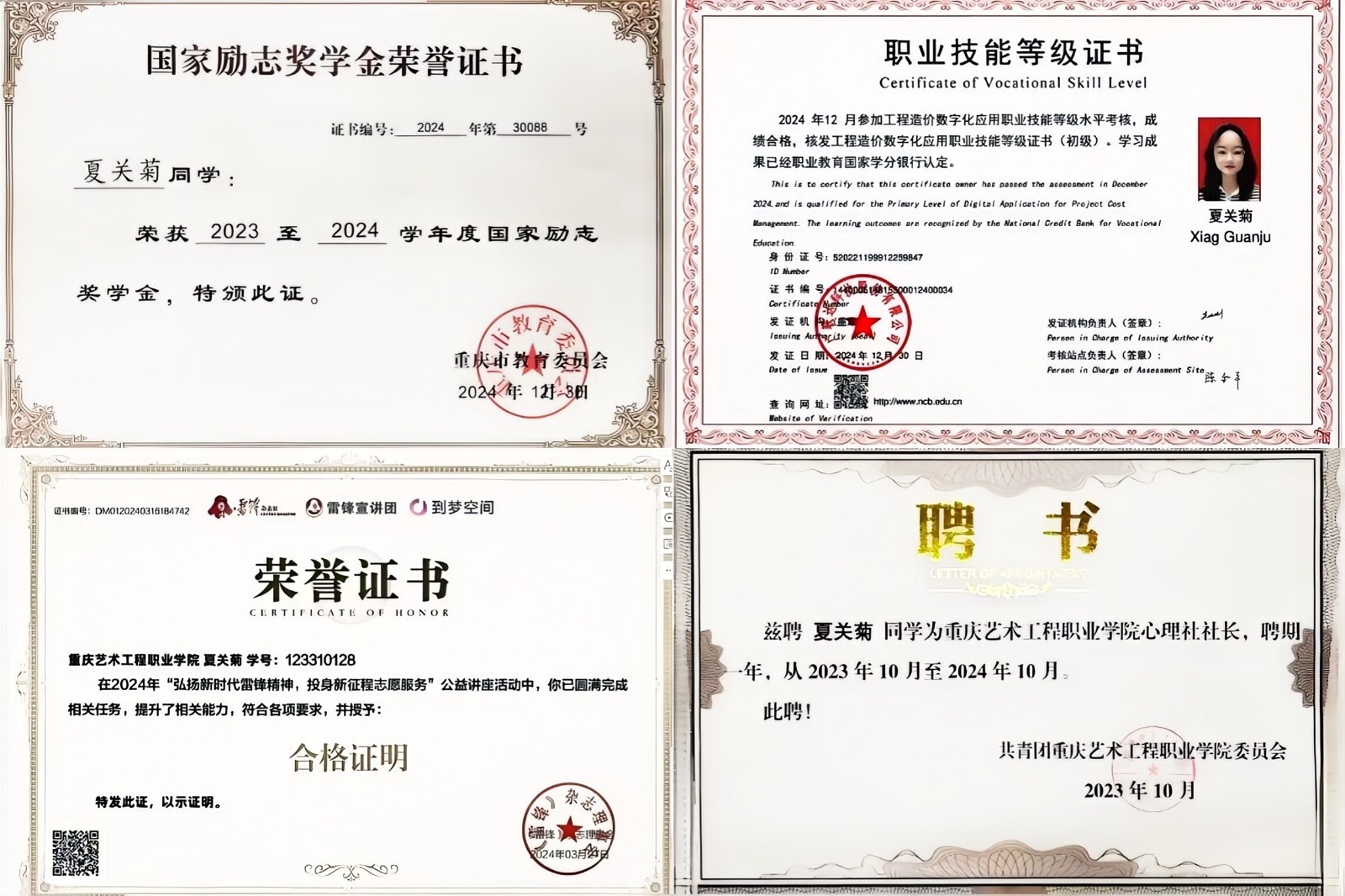 在社会实践与学生工作中,夏关菊同样表现卓越。作为院学生会副主席,她组织策划运动会、周末文化广场、迎新晚会、辩论赛等多项校园文化活动,体现出优秀的组织协调能力;担任班级心理委员及校心理社社长期间,她精心策划各种心理健康主题活动,在2024年“525心理健康月”中带领团队成功组织覆盖全校200余师生的活动,获评“校优秀干部”;作为专业竞赛协会企划负责人,她凭借扎实的专业知识和实操能力,携团队成员作为项目路演人在校级技能竞赛月中获一等奖、重庆市职业院校技能大赛一建设工程数字化计量与计价赛项银奖、全国“斯维尔杯”数字城市创新技术与应用大赛-BIM建模计量与计价和土建获二、三等奖等多项竞赛中斩获佳绩。