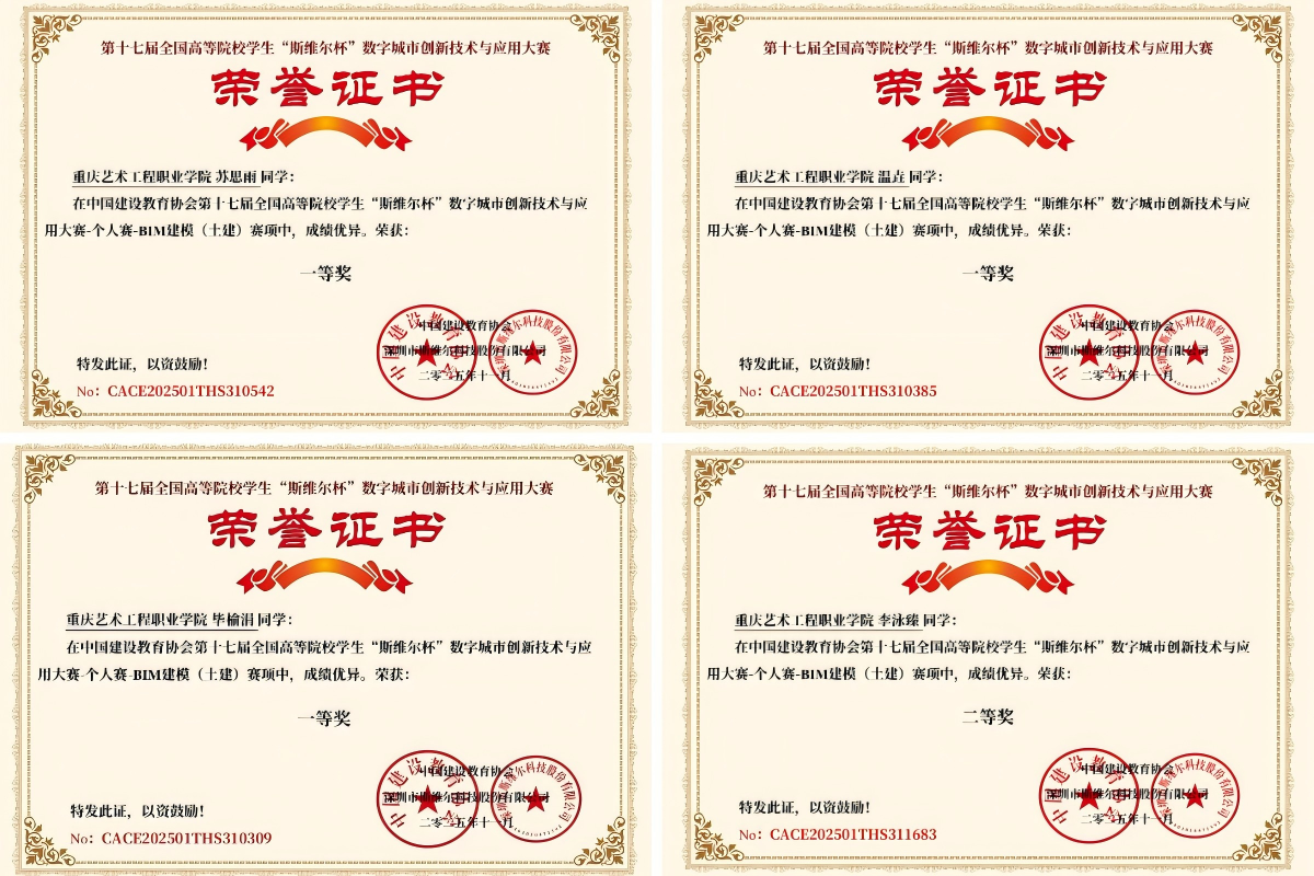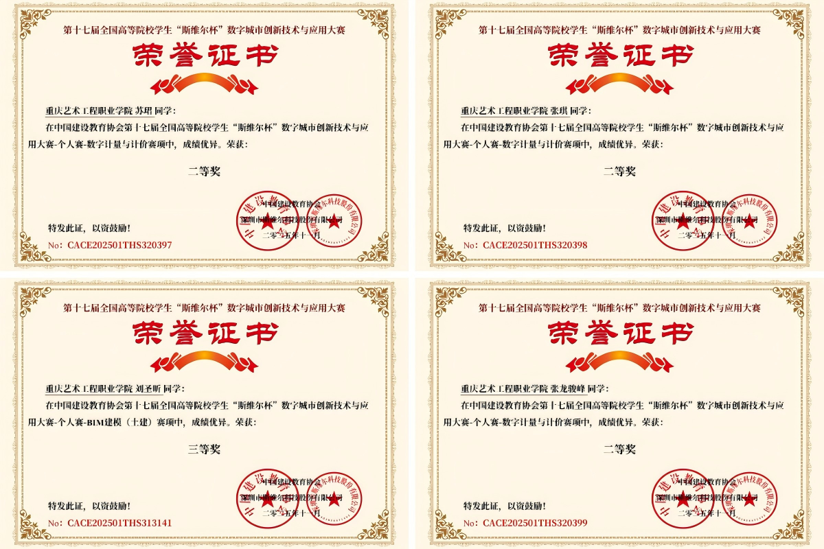 在激烈的角逐中,我校工程造价专业学生凭借过硬的专业素养和稳定的发挥脱颖而出:毕榆涓、苏思雨、温垚分别获个人赛一等奖;李泳臻、苏珺、张龙骏峰、张琪获个人赛二等奖;刘圣昕获三等奖。这份亮眼的成绩,既是参赛学子刻苦努力的成果,也是指导教师辛勤付出的回报,更是以党建引领专业发展、以实践育人提升人才培养质量的生动体现。学院将以此为契机,进一步深化党建与教育教学、实践育人的融合,持续优化人才培养模式,为数字城市建设等领域培养更多高素质、应用型专业人才。