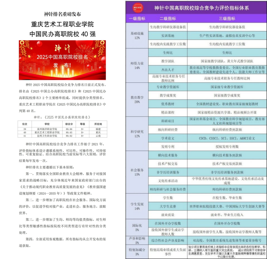 2025年,神针中国高职院校综合竞争力排名围绕高校的人才培养、科学研究、社会服务、国际交流等核心职能,从基础设施、师资力量、教育教学、科学研究、社会服务、学生发展、国际化、声誉与影响、特别加减分等9个评价维度、27个二级指标、60多个评价指标观察点,对全国346所民办高职院校进行综合竞争力排名,重庆艺术工程职业学院位列第40强。