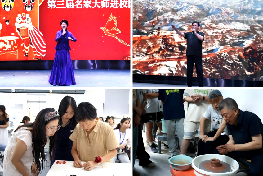 5月26日,学校隆重举行2025年艺术节暨第三届“名家大师进校园”活动,著名戏剧艺术家沈铁梅,著名话剧艺术家郝鹏寿,国家级非遗项目“荣昌陶”代表性传承人刘吉芬,著名服装设计师杨焱走进艺工,校园名家荟萃,人流如织。活动集中呈现了名家大师指导学子、非遗传承人才培养、戏曲进校园、高校原创文化精品展示交流等多个主题。学校原创交响乐《邱少云交响组曲》与沈铁梅《江姐》选段、重庆大学“中国舞蹈荷花奖”获奖作品《手龙人》同台演出。11月5日,刘吉芬大师将自己多年创作的陶艺精品捐赠给学校,陈列在陶艺实训室,为师生的学习创作发挥长久的作用。