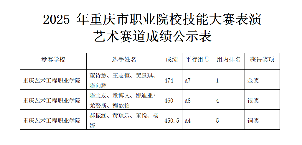 近日,2025 年重庆市职业院校技能大赛表演艺术赛道圆满落幕。重庆艺术工程职业学院三支参赛团队同台竞技、捷报频传,凭借深厚的艺术积淀、出色的舞台表现与高效的团队协作,从全市众多参赛队伍中脱颖而出,成功斩获 1 项金奖、1 项银奖、1 项铜奖,用实力彰显我校表演艺术专业的育人成效与学子的青春风采!