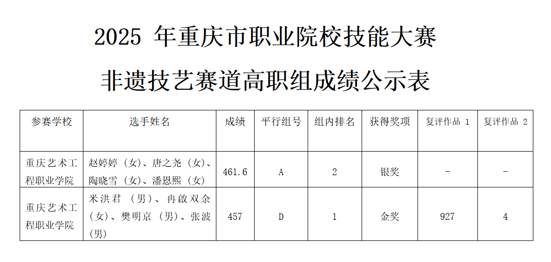 近日,2025 年重庆市职业院校技能大赛非遗技艺赛道高职组比赛圆满落幕。重庆艺术工程职业学院学子凭借扎实的专业功底、精湛的非遗技艺与默契的团队协作,在激烈角逐中脱颖而出,斩获 1 项金奖、1 项银奖,为学校赢得了荣誉,充分展现了我校在非遗技艺人才培养方面的丰硕成果。