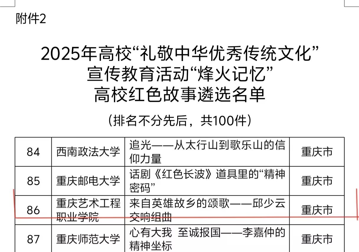 此次入选,是我校在传承红色文化、开展艺术创作、培育时代新人方面取得的重要成果。近年来,我校原创了《邱少云交响组曲》,以邱少云英雄事迹为题材的红色故事获重庆市民办高职院校特等奖,充分展现了我校师生弘扬英雄精神、赓续红色血脉的使命担当。特此报喜!