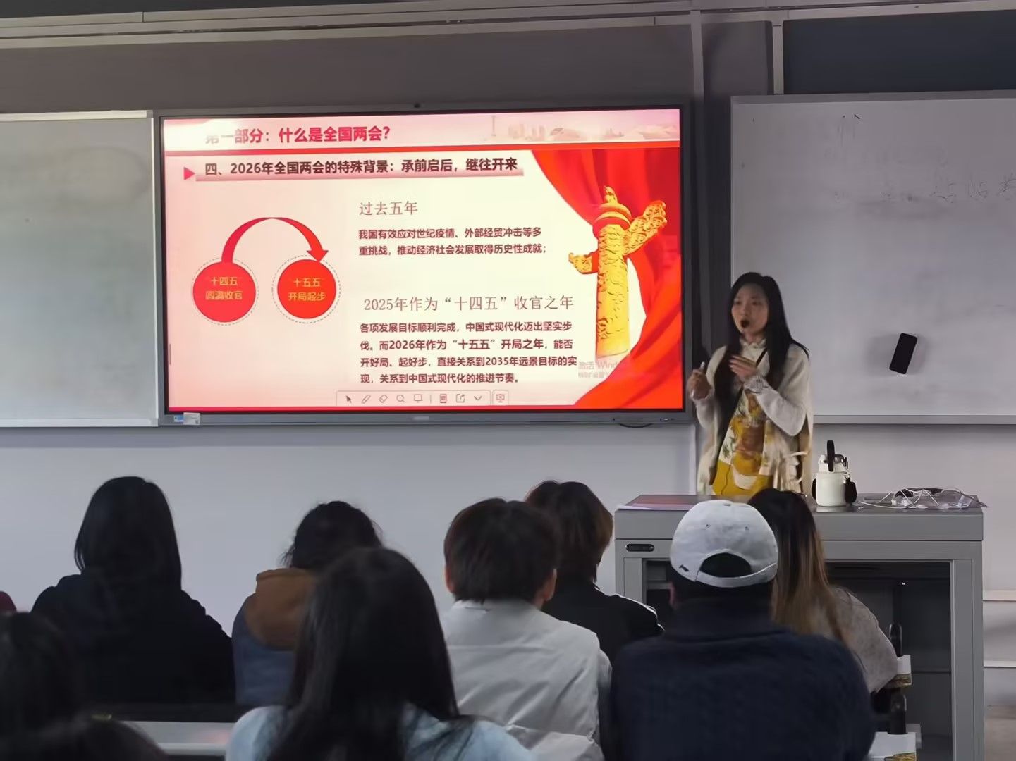 “报告中对‘一老一小’问题的统筹兼顾,对‘稳当下’与‘谋长远’的系统考量,处处闪耀着唯物辩证法的光辉。”《形式与政策》授课教师赵小琴运用唯物辩证法解读两会精神,面对老龄化压力与青年就业挑战并存局面,国家坚持“两点论”与“重点论”相统一,在高质量发展中寻找破解民生难题的钥匙,引导学生理解政策背后的“统筹兼顾”、看懂改革进程中的“稳中求进”,推动马克思主义立场观点方法真正入脑入心。在《中共党史》导言课中,冷洪达老师设计“从《马关条约》到‘十五五’蓝图”对比教学案例,紧扣“中国人民为救亡图存和实现中华民族伟大复兴而英勇奋斗”主线,指出全国两会描绘的“十五五”宏伟目标,正是近代以来无数仁人志士梦寐以求的复兴景象。这一案例让学生明白,《中共党史》课学习的不仅是历史事件,更是历史逻辑:中国共产党的领导是历史的选择、人民的选择,是实现中华民族伟大复兴的根本保证。