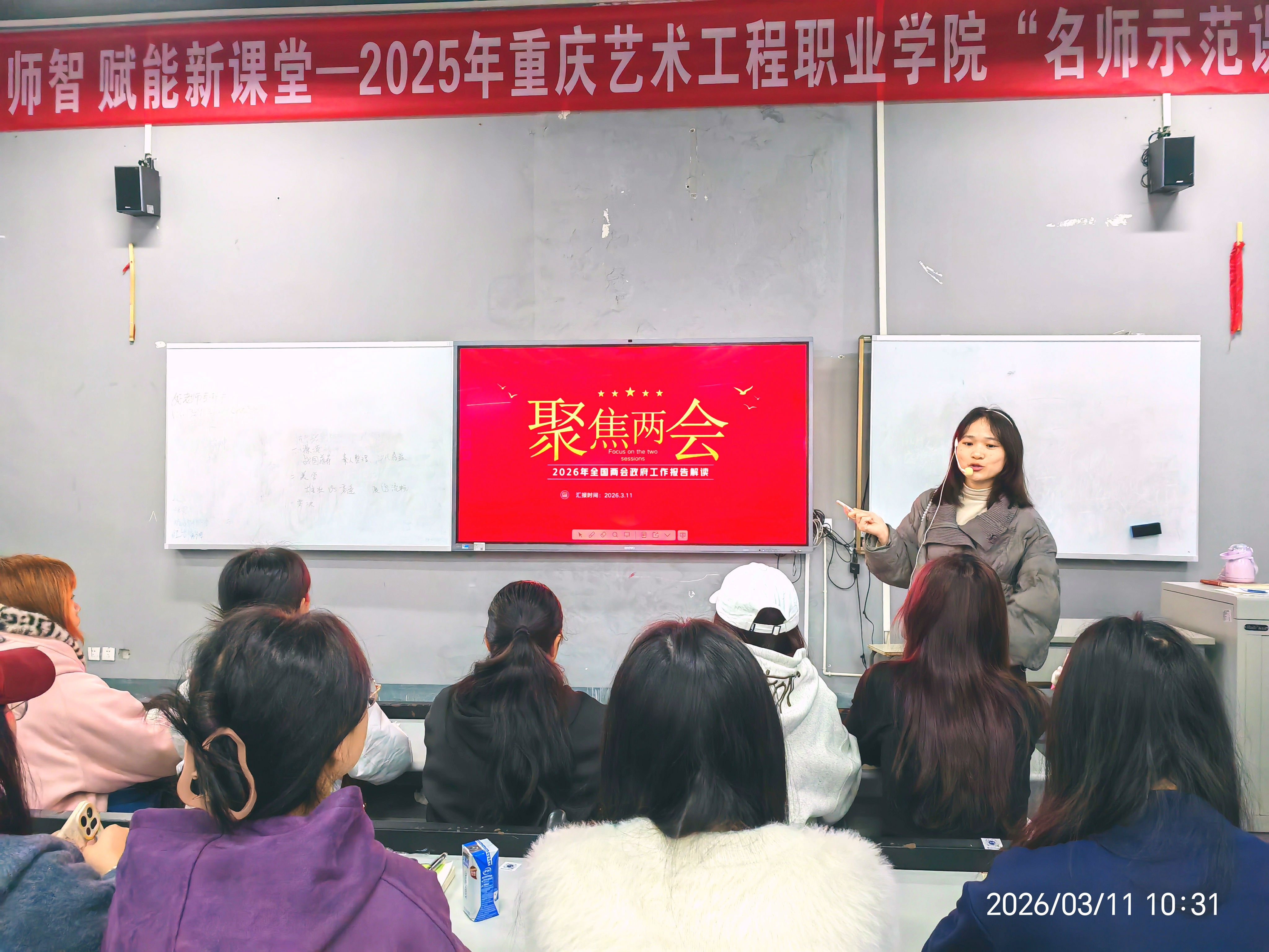 授课实践中,一堂堂鲜活生动的“两会思政课”陆续开讲,让思想教育真正“活”起来、“实”起来。张燕老师在《毛泽东思想和中国特色社会主义理论体系概论》授课中,精心选取政府工作报告中的鲜活数据,以直观数字变化展现国家经济转型升级、高质量发展的生动实践,让学生清晰感知国家发展的强劲动能与坚实步伐。王静雯老师在《思想道德与法治》课堂上,引用“我国经济总量突破140万亿元大关,新质生产力蓬勃发展,人民生活水平稳步提高”的发展成就,结合新时代十年发展历程,阐明这十年既是国家跨越发展的“黄金十年”,也是青年一代拔节成长的“青春十年”,引导学生深刻认识到新质生产力需要新青年用过硬本领去创造,民族复兴需要青年一代用实干担当去实现。