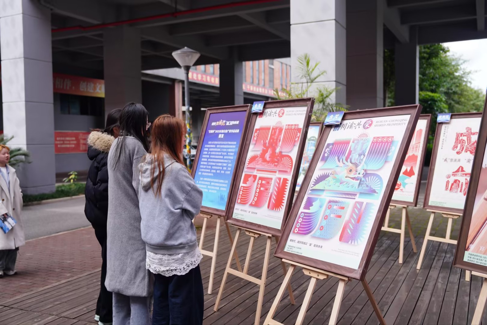 上午10时,来自视觉传媒学院等学院的数百名师生代表共同见证活动启幕。本次共展出大赛平面类获奖佳作27件,作品聚焦川渝人文风采、城乡建设与精神文明建设,兼具思想性与艺术性。其中,荣获大赛平面类金奖的《川渝共荣》由我校视觉传媒学院教师郭宇飞创作,充分展现了我校教师的专业实力,成为展览一大亮点。