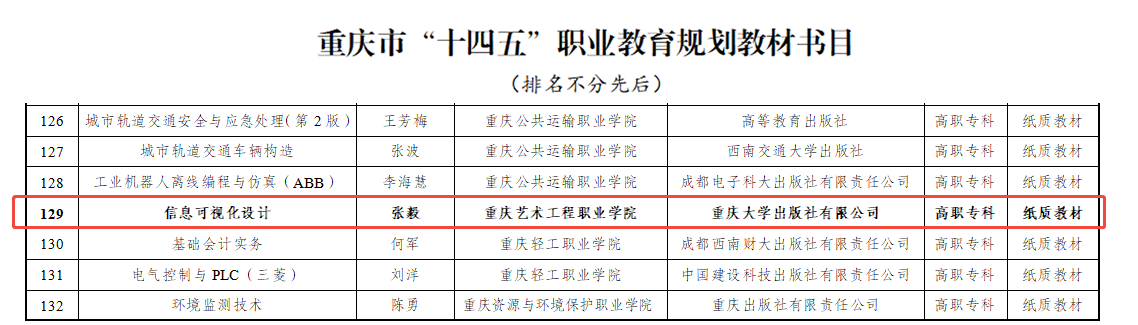 近日,重庆市教育委员会正式公布重庆市“十四五”第二批职业教育规划教材入选书目。由我校张毅老师主编的《信息可视化设计》教材成功入选,标志着学校在教材建设领域取得市级层面重要突破。