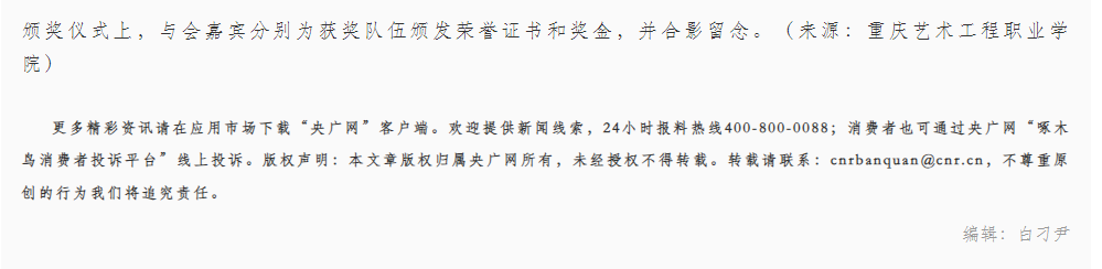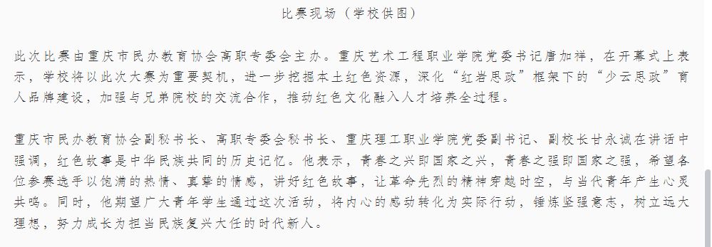 央广网:第四届红色故事大赛举行 重艺原创故事获特等奖 阅读:次 更新时间: 2025-11-25 摄影:| 编辑:liaobing 原文链接:https://apicnrapp.cnr.cn/html/share.html?id=30402887&ui=b1MIJwm7mNzPjysH0Nk6efkithJ6XPxxgpO92JQXASO+B60kxY2LM+8SQ0uIF+PG&action=share&type=1 上一篇:新华社:第四届红色故事大赛成功举行 原创少云故事获特等奖 下一篇:重庆市高等教育学会:重庆民办高职院校第四届红色故事大赛 奏响“思政教育+故事宣讲”立德树人乐章 分享到