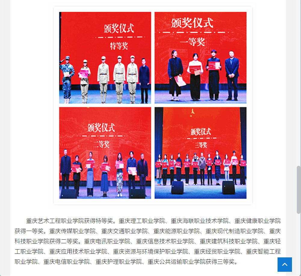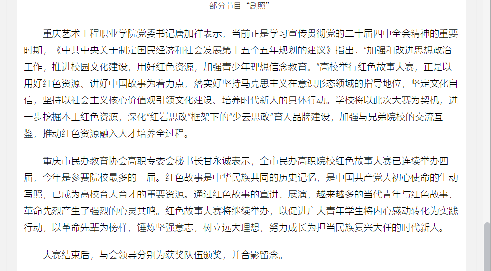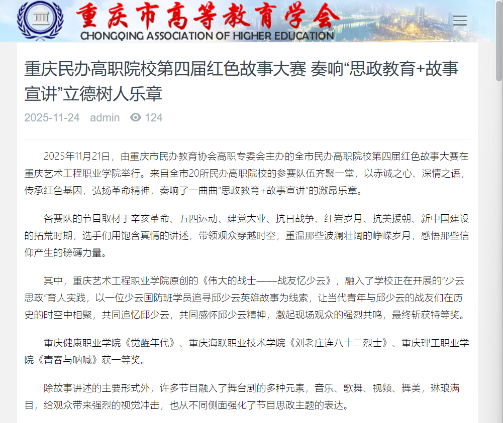 重庆市高等教育学会:重庆民办高职院校第四届红色故事大赛 奏响“思政教育+故事宣讲”立德树人乐章 阅读:次 更新时间: 2025-11-25 摄影:| 编辑:liaobing 原文链接:https://www.cqgjxh.com/bygj/shownews.php?id=2588 上一篇:央广网:第四届红色故事大赛举行 重艺原创故事获特等奖 下一篇:最后一页 分享到