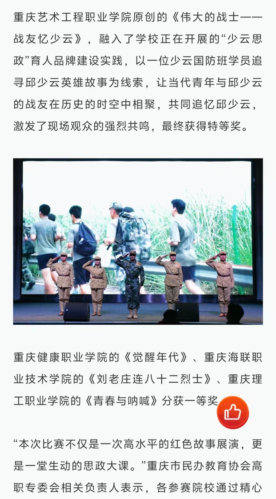 铜梁融媒体中心:重庆市民办高职院校第四届红色故事大赛在铜举行 阅读:次 更新时间: 2025-11-30 摄影:| 编辑:liaobing 原文链接:https://shareapp.cqliving.com/10/h5/article/1441837909138837504/h5/content_1441837909138837504.html 上一篇:中国教育在线:传承红色基因,赓续精神血脉!重庆市民办高职院校第四届红色故事大赛圆满落幕 下一篇:最后一页 分享到