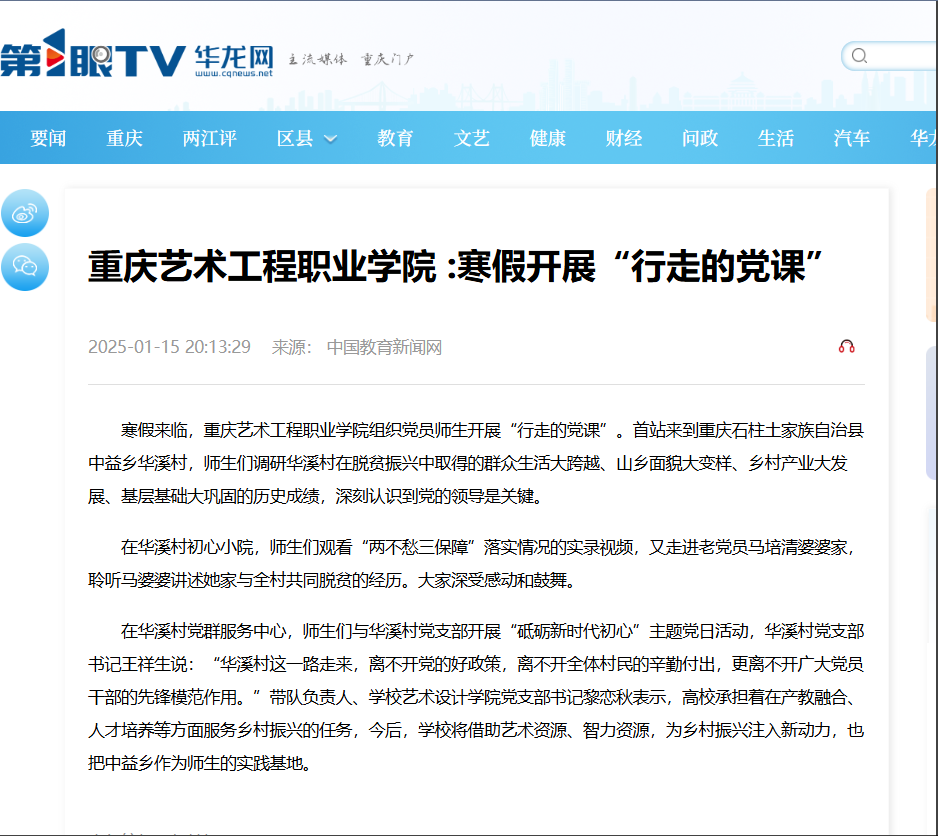 第1眼TV-华龙网:重庆艺术工程职业学院 :寒假开展“行走的党课” 阅读:次 更新时间: 2026-01-04 摄影:| 编辑:Liaobing 原文链接:https://www.cqnews.net/1/detail/1329182007516037121/web/content_1329182007516037121.html 上一篇:党建网:重庆艺术工程职业学院:寒假开展“行走的党课” 下一篇:新浪:重庆艺术工程职业学院 :寒假开展“行走的党课” 分享到