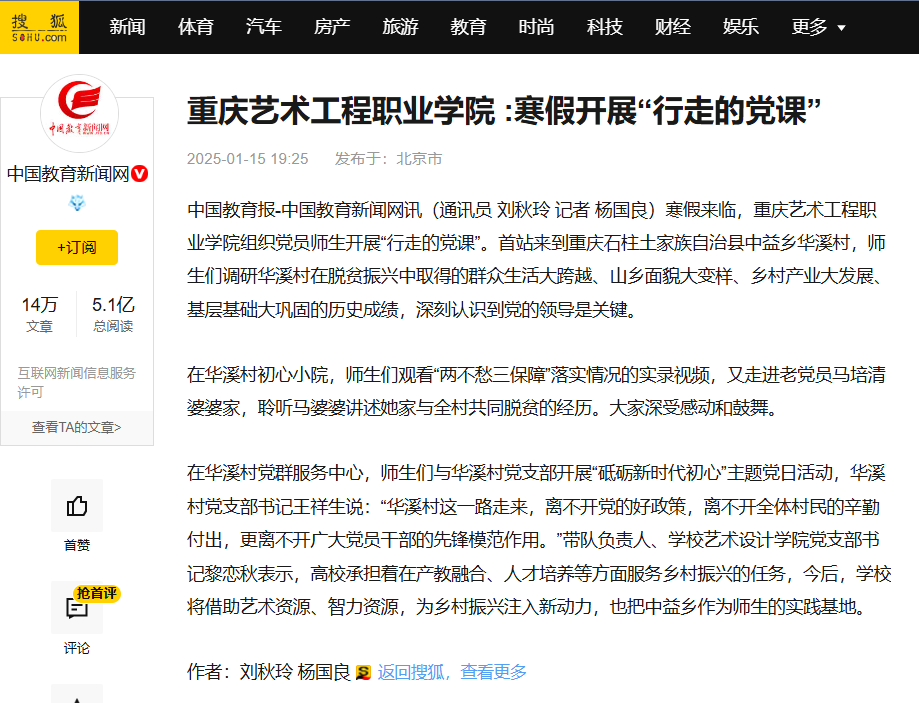 搜狐:重庆艺术工程职业学院 :寒假开展“行走的党课” 阅读:次 更新时间: 2026-01-04 摄影:| 编辑:Liaobing 原文链接:https://www.sohu.com/a/849366763_243614 上一篇:新浪:重庆艺术工程职业学院 :寒假开展“行走的党课” 下一篇:网易:重庆艺术工程职业学院 :寒假开展“行走的党课” 分享到