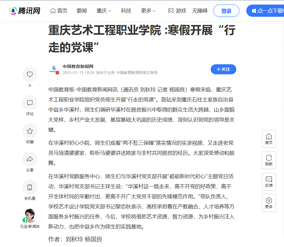 腾讯:重庆艺术工程职业学院 :寒假开展“行走的党课” 阅读:次 更新时间: 2026-01-04 摄影:| 编辑:Liaobing 原文链接:https://news.qq.com/rain/a/20250115A07ZGU00 上一篇:网易:重庆艺术工程职业学院 :寒假开展“行走的党课” 下一篇:最后一页 分享到
