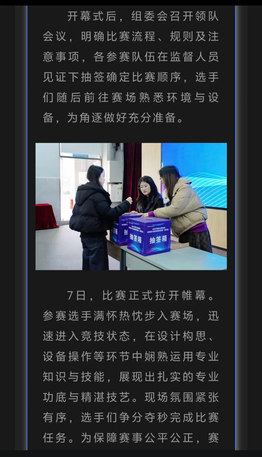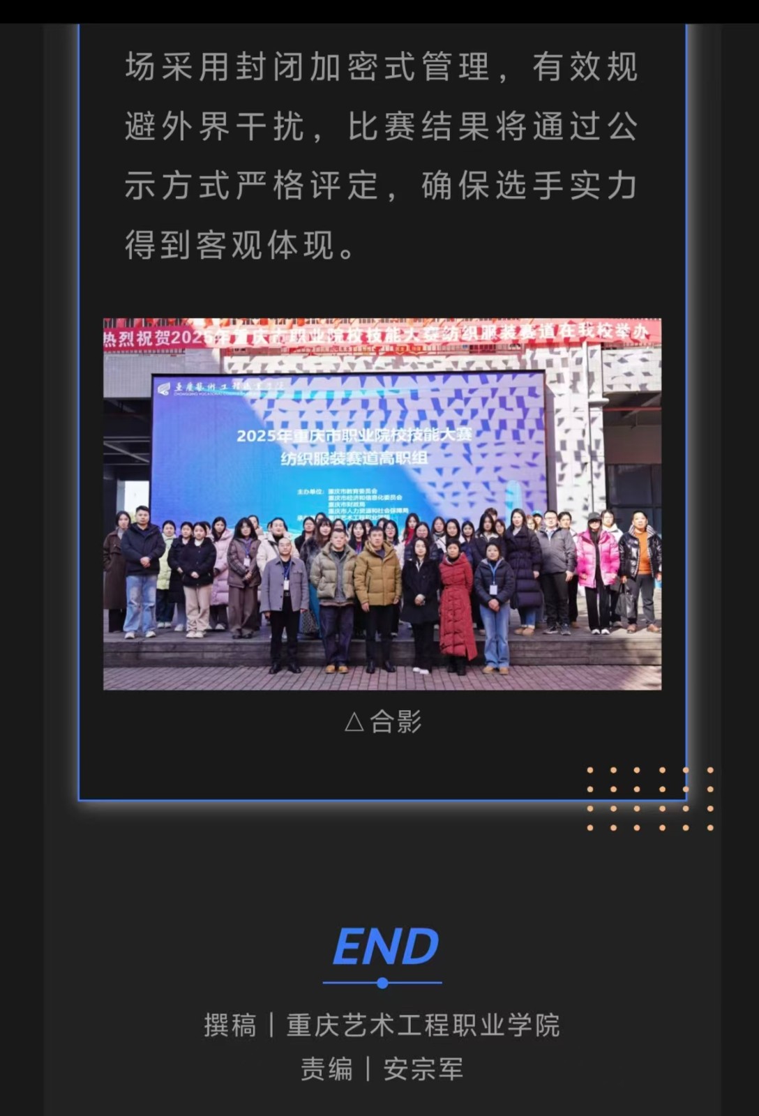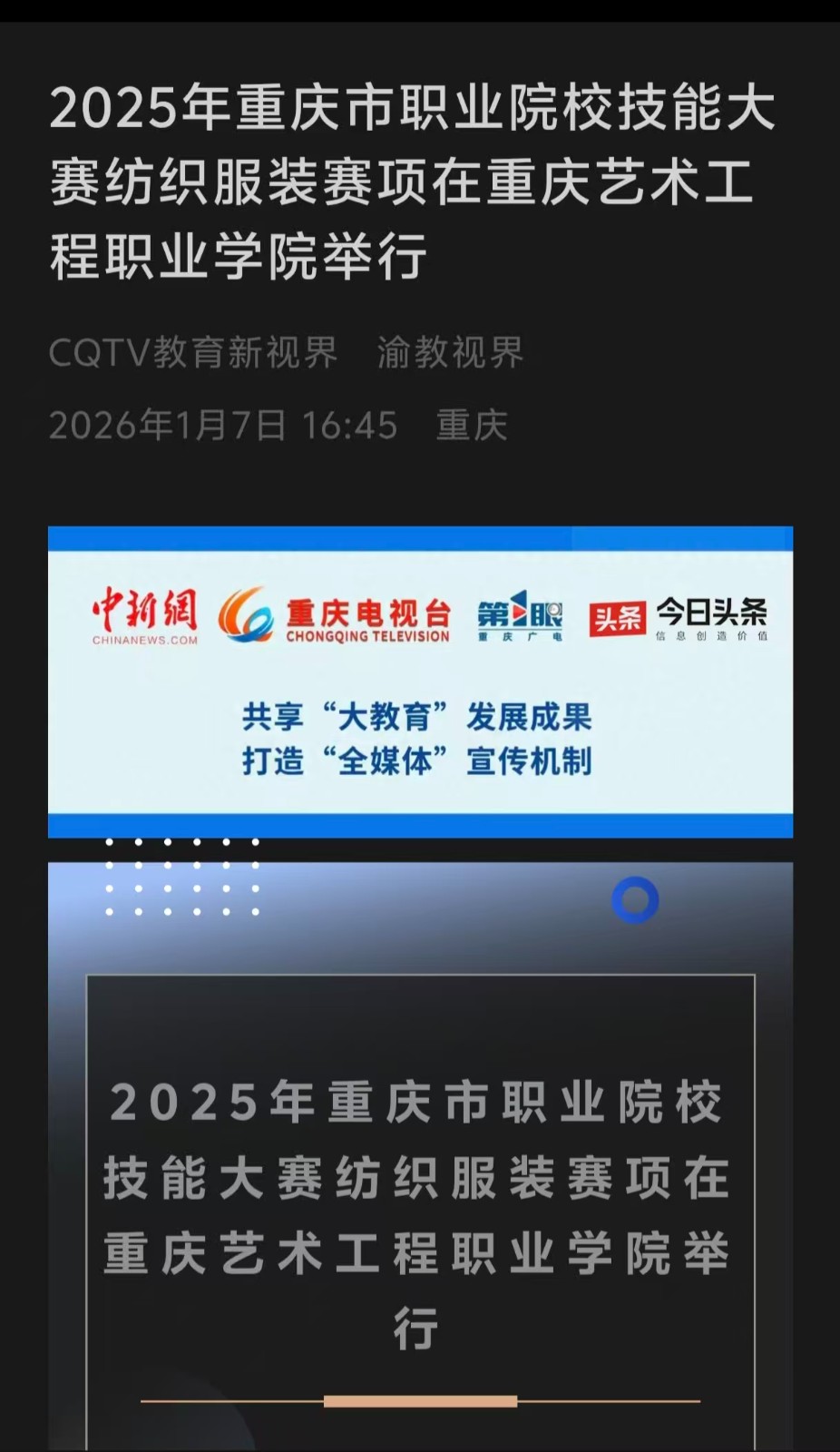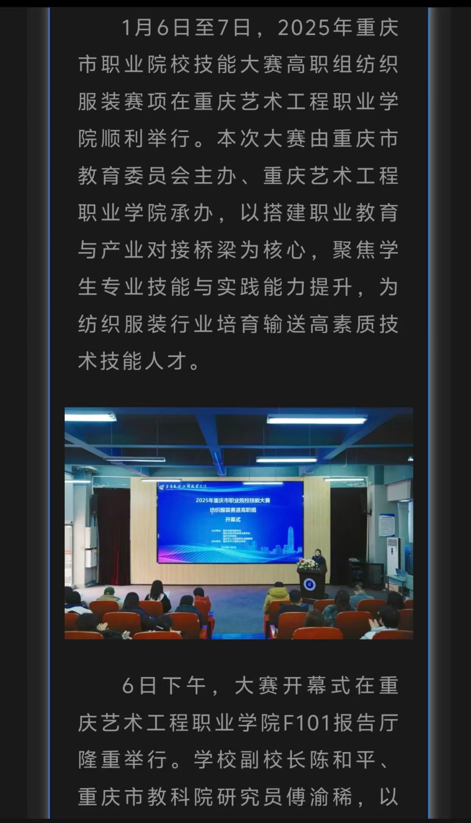 重庆电视台:2025年重庆市职业院校技能大赛纺织服装赛项在重庆艺术工程职业学院举行 阅读:次 更新时间: 2026-01-09 摄影:| 编辑:liaobing 原文链接:https://mp.weixin.qq.com/s/Am499yUpdnNfJRN1ZzJKOw?scene=262&from=industrynews#rd 上一篇:第一眼:2025年重庆市职业院校技能大赛纺织服装赛项在重庆艺术工程职业学院举行 下一篇:中国教育在线:以赛促学培育高素质人才重庆艺术工程职院承办专项赛事 分享到