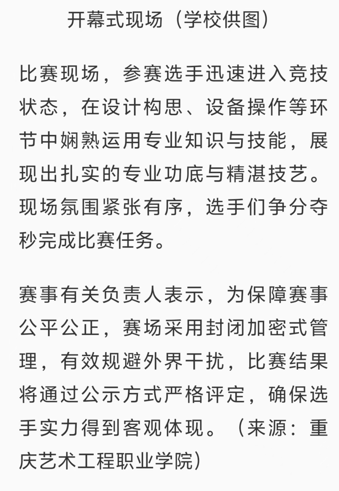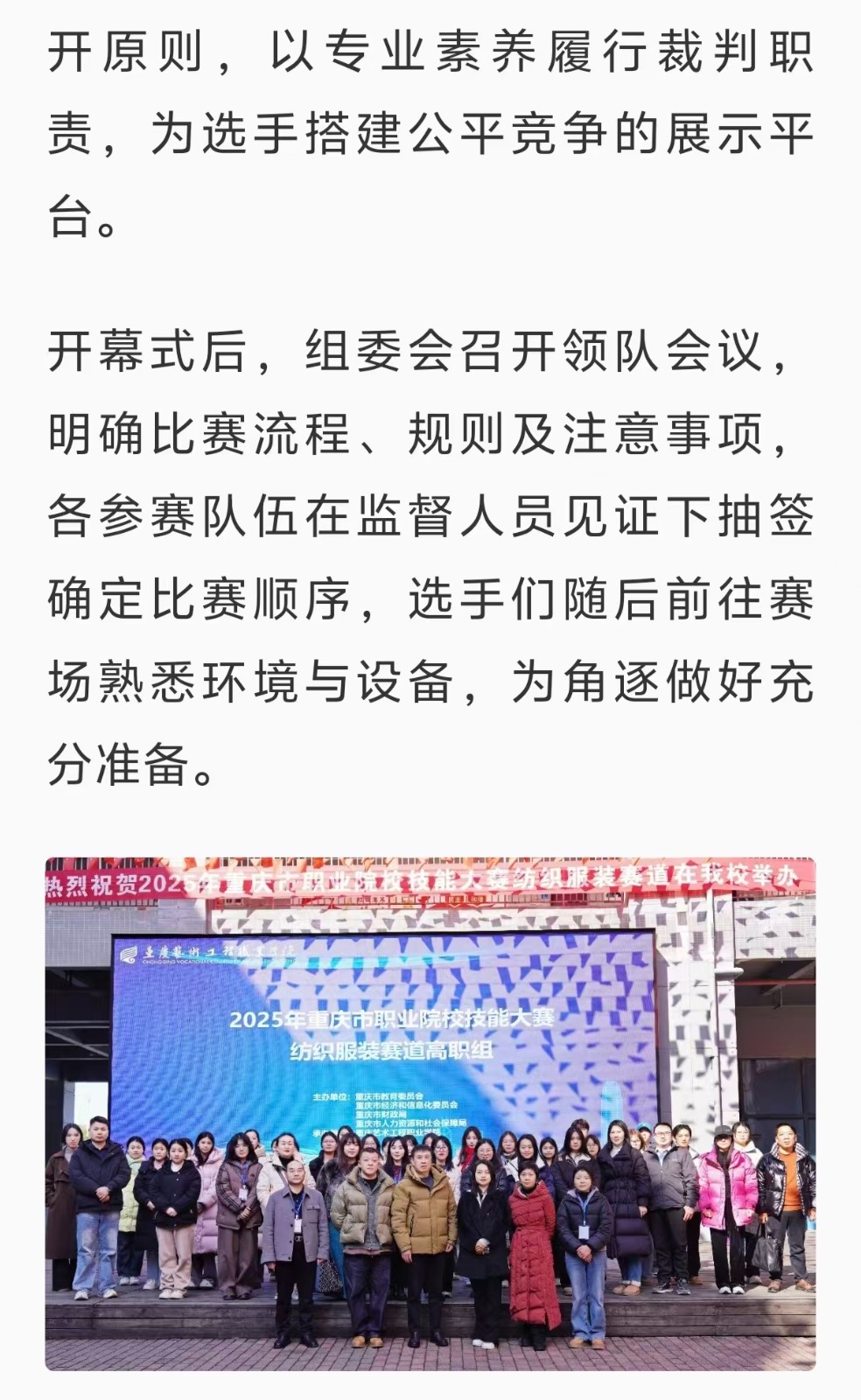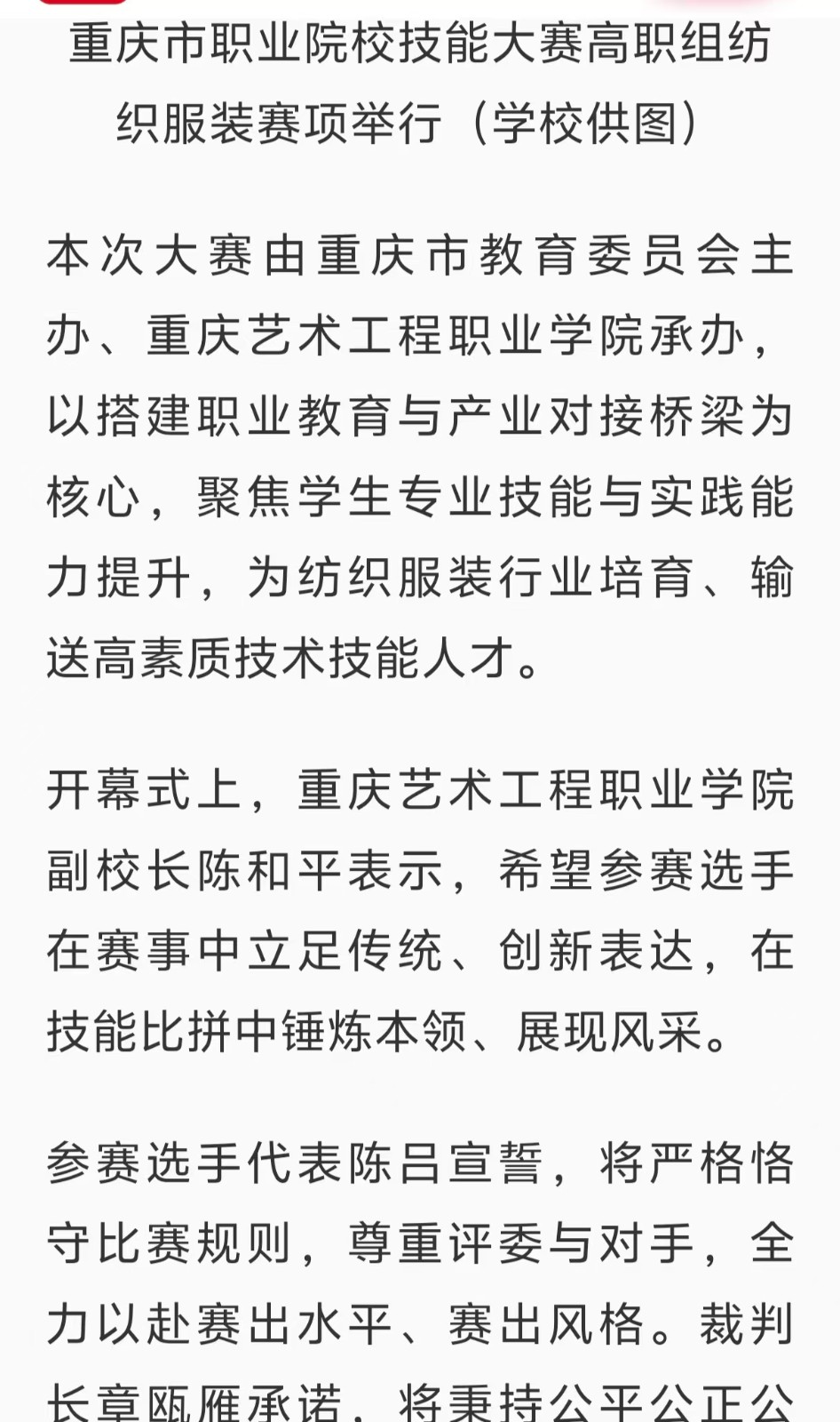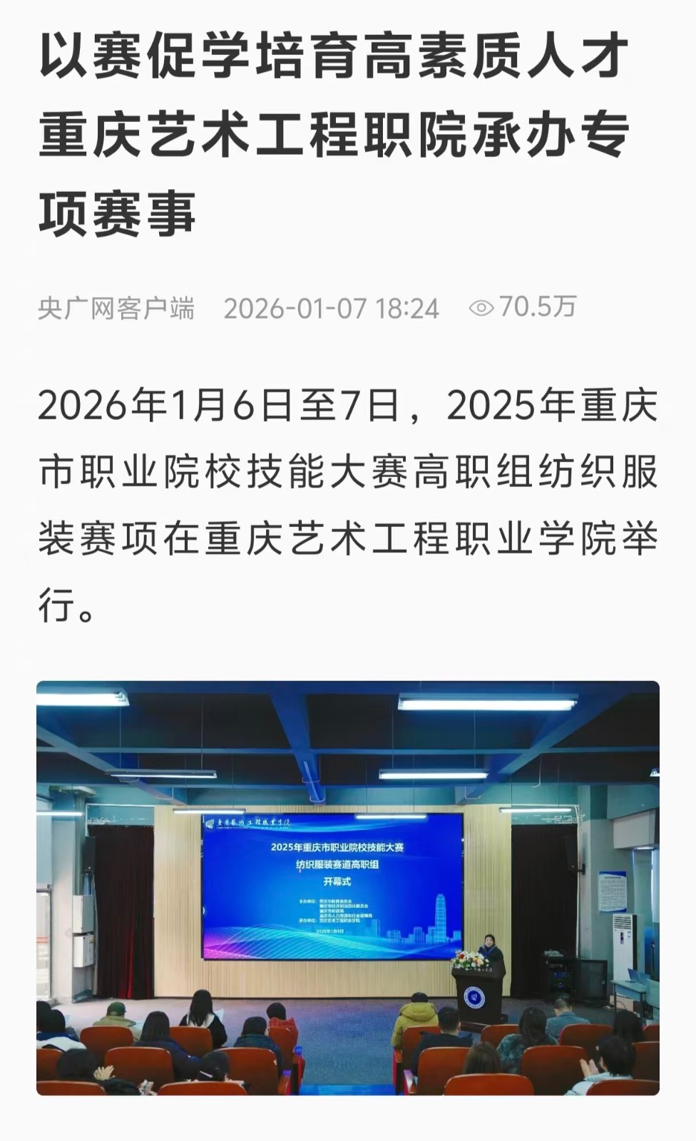 中国教育在线:以赛促学培育高素质人才重庆艺术工程职院承办专项赛事 阅读:次 更新时间: 2026-01-08 摄影:| 编辑:liaobing 原文链接:https://apicnrapp.cnr.cn/html/share.html?id=30496882&ui=MjID3bs30W3FnJFR4CDCKbLfKxCrI4BIYzXEGN3wwwuLV0so/rTavPHo7Dr0tx3g&action=share&type=1 上一篇:重庆电视台:2025年重庆市职业院校技能大赛纺织服装赛项在重庆艺术工程职业学院举行 下一篇:铜梁融媒体中心:2025年重庆市职业院校技能大赛高职组纺织服装赛项在铜梁举行 分享到