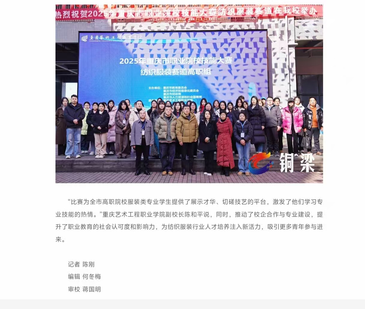 铜梁融媒体中心:2025年重庆市职业院校技能大赛高职组纺织服装赛项在铜梁举行 阅读:次 更新时间: 2026-01-09 摄影:| 编辑:liaobing 原文链接:https://cqtl.cn/news/detail/5000735282?columnId=7027 上一篇:中国教育在线:以赛促学培育高素质人才重庆艺术工程职院承办专项赛事 下一篇:中国教育在线:重庆市高职组纺织服装技能大赛落幕,重庆艺术工程职业学院选手摘得桂冠 分享到