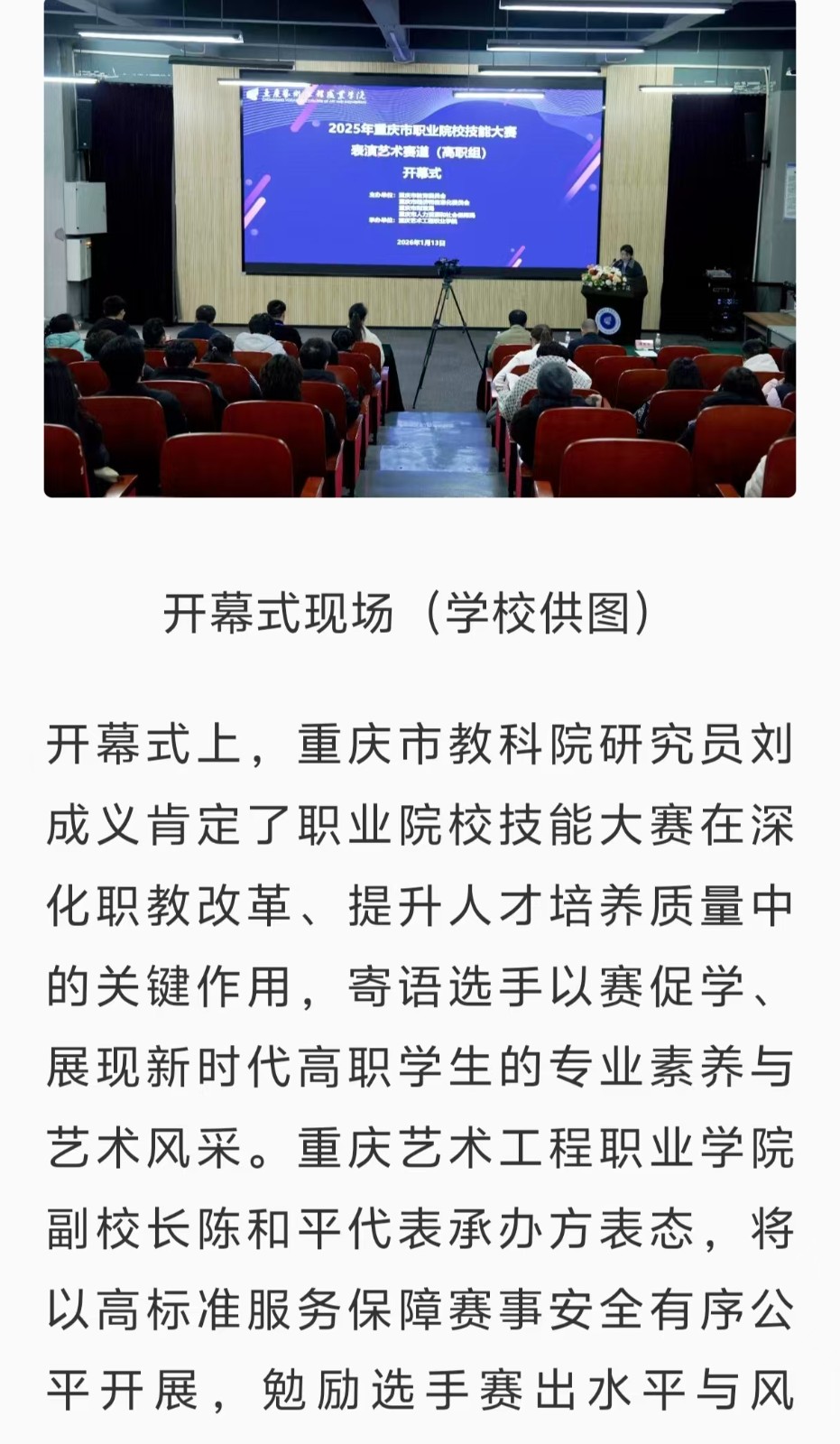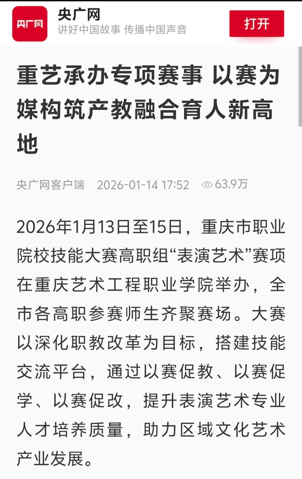 央广网:重艺承办专项赛事以赛为媒构筑产教融合育人新高地 阅读:次 更新时间: 2026-01-15 摄影:| 编辑:liaobing 原文链接:https://apicnrapp.cnr.cn/html/share.html?id=30511051&ui=fC896k0if6rOh9u55AN7QvOxlp01qPlQNHzCiUrVxe47iylI4LyZ4yw1XSQggxe6&action=share&type=1 上一篇:新华网:重庆纺织服装技能大赛搭建产教融合新平台 下一篇:中国教育在线:重庆市职业院校技能大赛高职组"表演艺术"赛项在重庆艺术工程职业学院举办 分享到