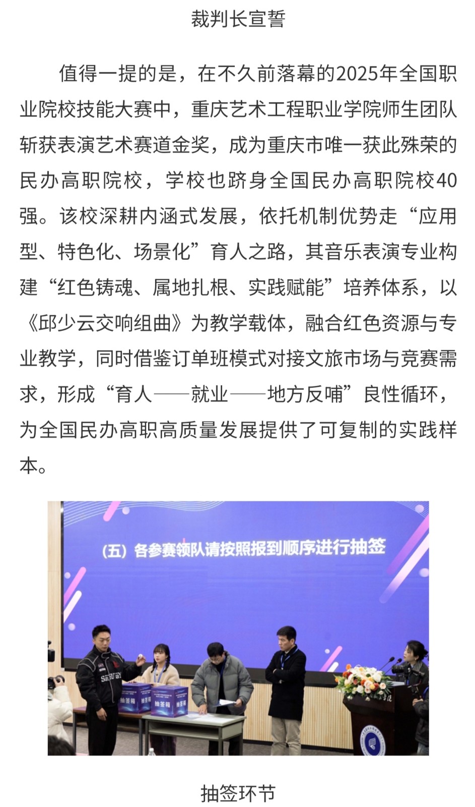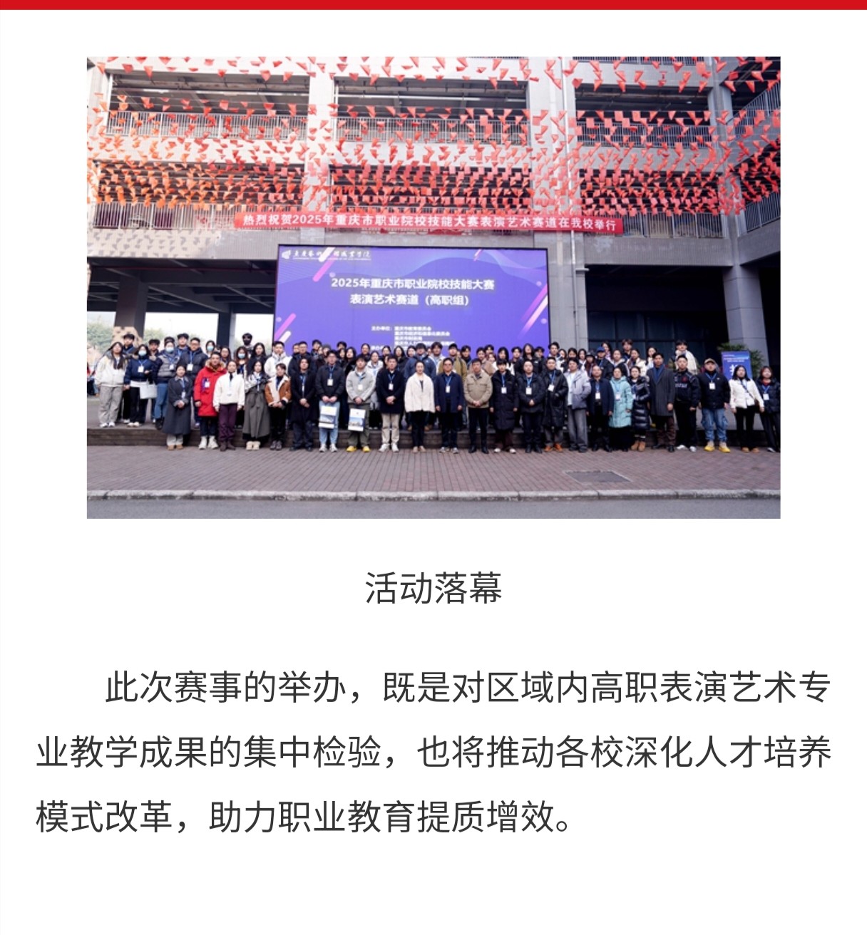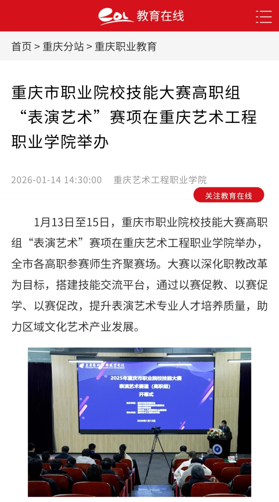 中国教育在线:重庆市职业院校技能大赛高职组"表演艺术"赛项在重庆艺术工程职业学院举办 阅读:次 更新时间: 2026-01-15 摄影:| 编辑:liaobing 原文链接:https://chongqing.eol.cn/cqzy/202601/t20260114_2715844.shtml 上一篇:央广网:重艺承办专项赛事以赛为媒构筑产教融合育人新高地 下一篇:最后一页 分享到