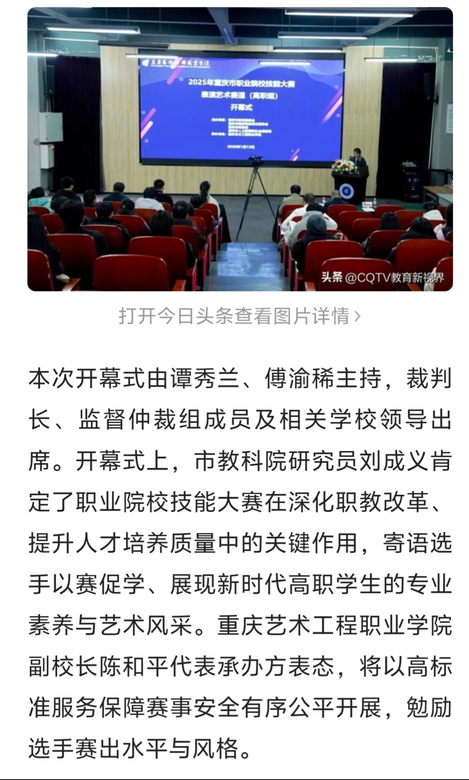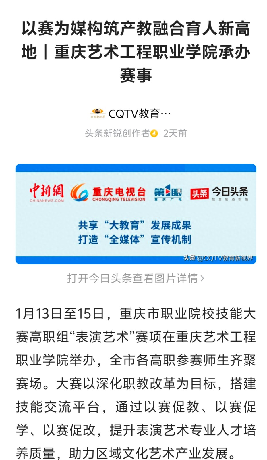 今日头条教育栏目:以赛为媒构筑产教融合育人新高地重庆艺术工程职业学院承办赛事 阅读:次 更新时间: 2026-01-16 摄影:| 编辑:liaobing 原文本链接:https://m.toutiao.com/article/7595058529132708387/?app=news_article&category_new=profile_all&module_name=Android_tt_others&share_did=MS4wLjACAAAAJDxxJW7ugLTLthGnVN3akrv13p09ZxefxqAqjHwDHAbE9gZDRP1vtwZKO0hY6hnZ&share_uid=MS4wLjABAAAAaU9mimZZu-r5UeATOPyNMi2Q462KDMAmbhMBjJHttJFxeWwxZ1DOYN6bss1iE-FO×tamp=1768382323&tt_from=wechat&upstream_biz=Android_wechat&use_new_style=1&utm_campaign=client_share&utm_medium=toutiao_android&utm_source=wechat&share_token=dc83b80a-f672-41ce-901d-4310a0fcc6d7 上一篇:今日头条:以赛为媒构筑产教融合育人新高地重庆艺术工程职业学院承办专项赛事 下一篇:今日头条:以赛为媒构筑产教融合育人新高地|重庆艺术工程职业学院承办赛事 分享到
