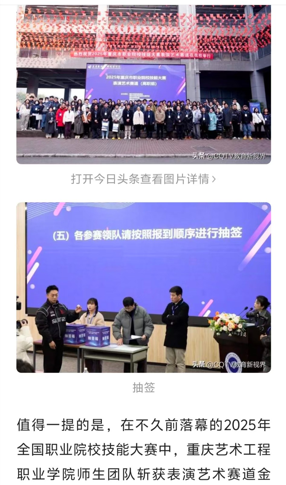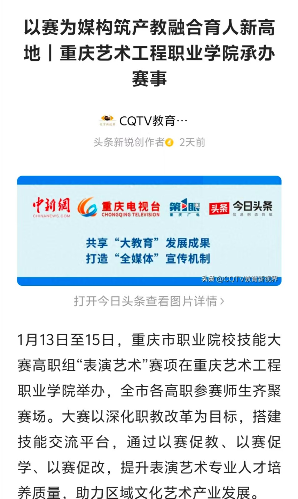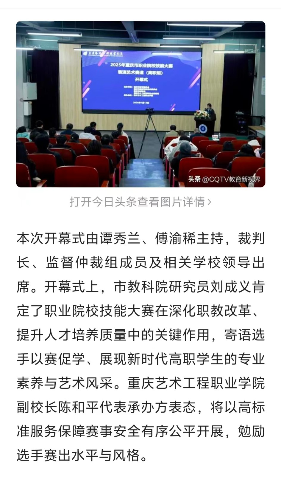 今日头条:以赛为媒构筑产教融合育人新高地|重庆艺术工程职业学院承办赛事 阅读:次 更新时间: 2026-01-16 摄影:| 编辑:liaobing 原文链接:https://m.toutiao.com/article/7595058529132708387/?app=news_article&category_new=profile_all&module_name=Android_tt_others&share_did=MS4wLjACAAAAJDxxJW7ugLTLthGnVN3akrv13p09ZxefxqAqjHwDHAbE9gZDRP1vtwZKO0hY6hnZ&share_uid=MS4wLjABAAAAaU9mimZZu-r5UeATOPyNMi2Q462KDMAmbhMBjJHttJFxeWwxZ1DOYN6bss1iE-FO×tamp=1768382323&tt_from=wechat&upstream_biz=Android_wechat&use_new_style=1&utm_campaign=client_share&utm_medium=toutiao_android&utm_source=&share_token=dc83b80a-f672-41ce-901d-4310a0fcc6d7&wxshare_count=2 上一篇:今日头条教育栏目:以赛为媒构筑产教融合育人新高地重庆艺术工程职业学院承办赛事 下一篇:最后一页 分享到