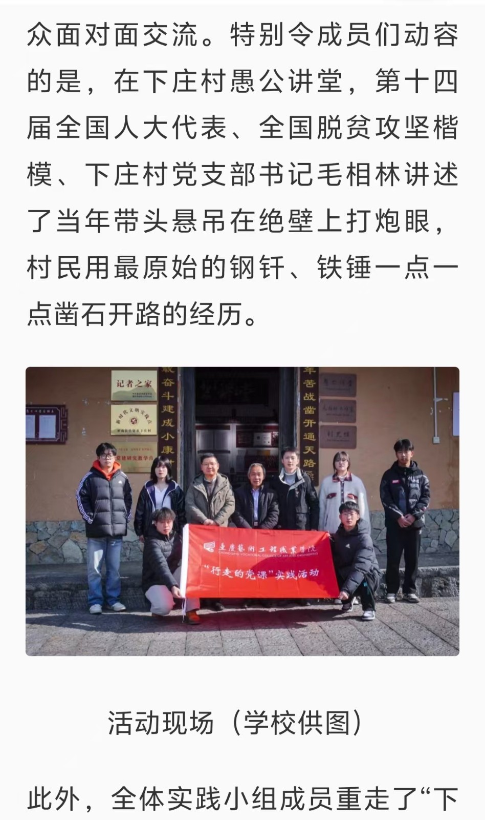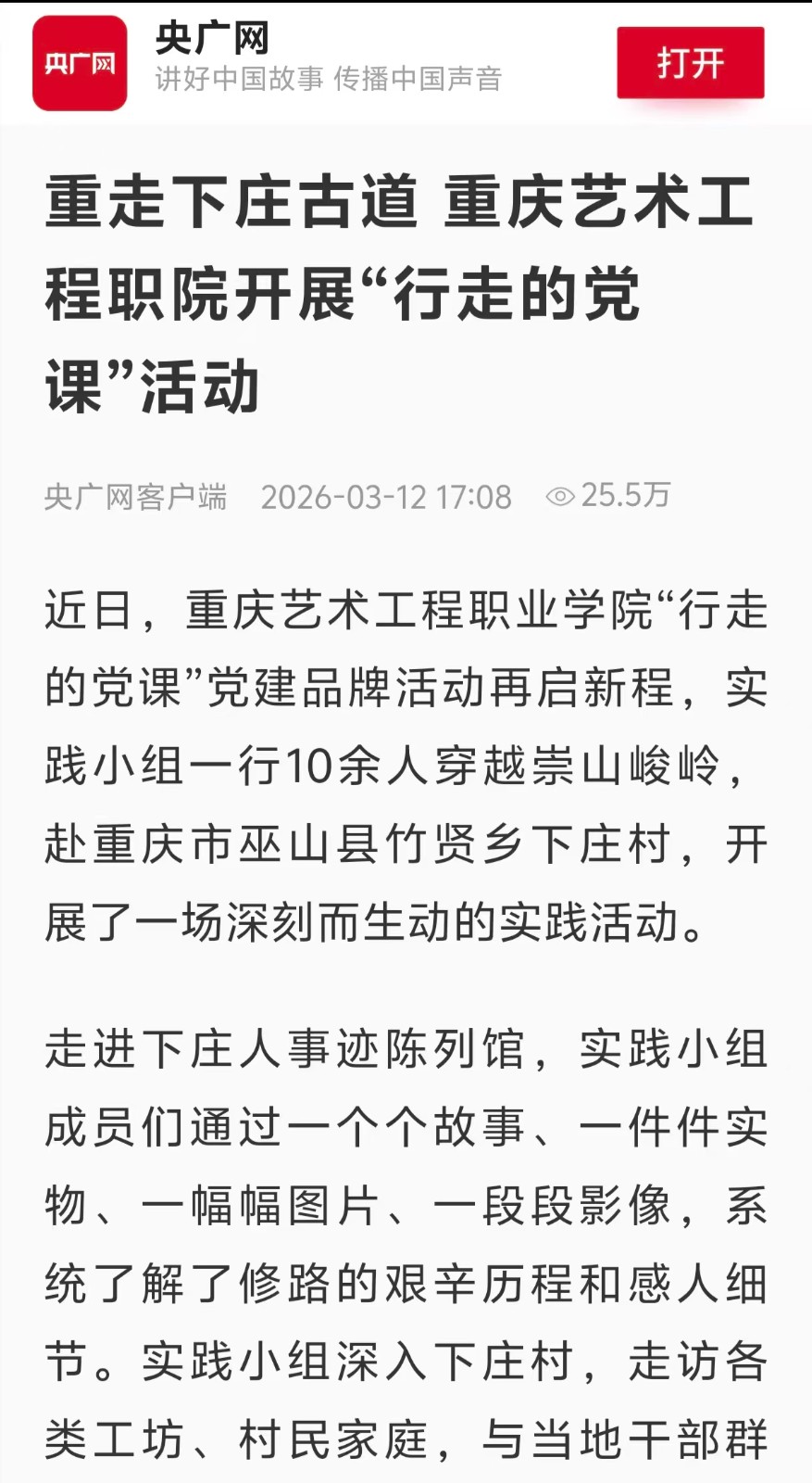 央广网:重走下庄古道 重庆艺术工程职院开展“行走的党课”活动 阅读:次 更新时间: 2026-03-12 摄影:| 编辑:LiuQiuLin 原文链接:https://apicnrapp.cnr.cn/html/share.html?id=30617840&ui=9482NmuVcx1UOMs5AFwLan07vJj/NAIRH8JAE7y+UKSc4baRi/wEuzuhhXOzQUzM&action=share&type=1 上一篇:今日头条:以赛为媒构筑产教融合育人新高地|重庆艺术工程职业学院承办赛事 下一篇:最后一页 分享到