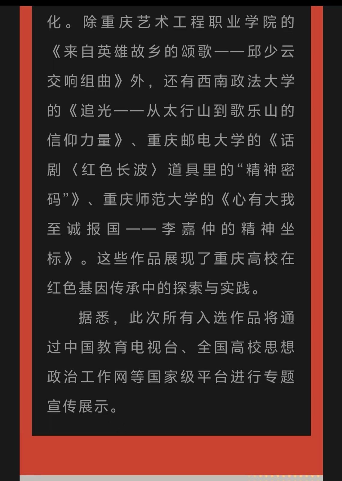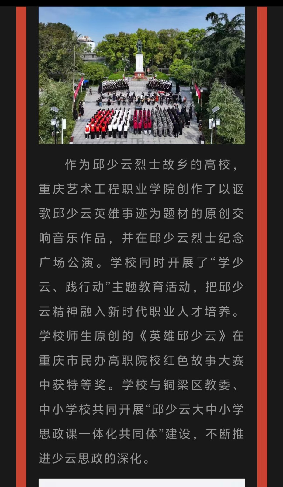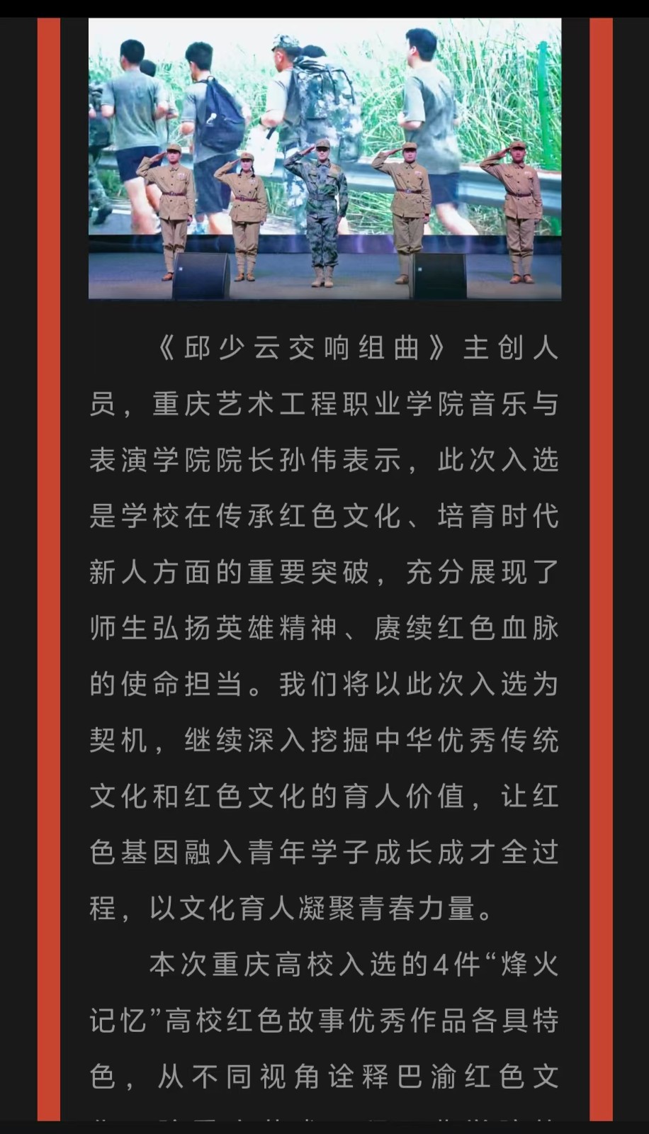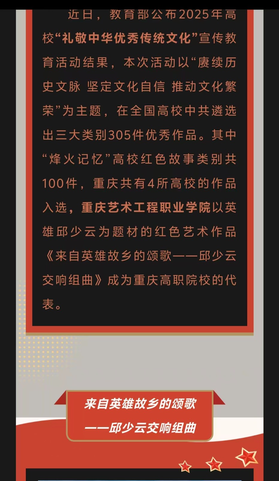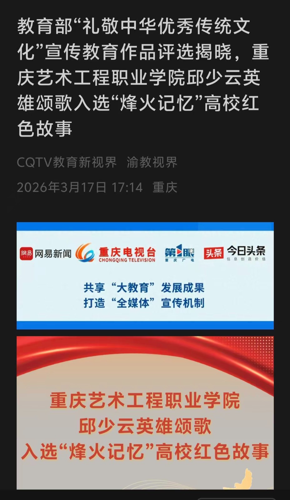 重庆电视台:教育部“礼敬中华优秀传统文化”宣传教育作品评选揭晓,重庆艺术工程职业学院邱少云英雄颂歌入选“烽火记忆”高校红色故事 阅读:次 更新时间: 2026-03-17 摄影:| 编辑:LiuQiuLin 原文链接:https://mp.weixin.qq.com/s/_7JQN-CB2d9Hdq_5votVtA?scene=262&from=industrynews#rd 上一篇:今日头条:重庆艺工职院邱少云英雄颂歌入选“烽火记忆”高校红色故事 下一篇:央广网:重庆艺工职院英雄颂歌入选“烽火记忆”高校红色故事 分享到
