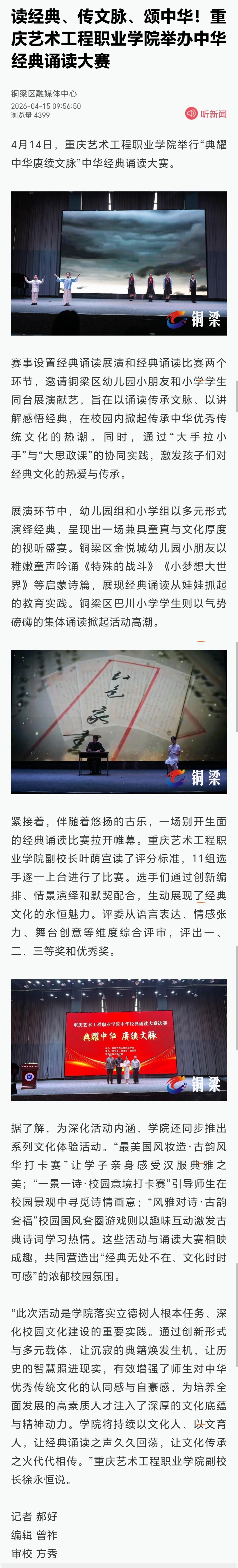 铜梁区融媒体中心:读经典、传文脉、颂中华!重庆艺术工程职业学院举办中华经典诵读大赛 阅读:次 更新时间: 2026-04-16 摄影:| 编辑:liaobing 原文链接:https://shareapp.cqliving.com/10/app/article/1493898863226941440/app/content_1493898863226941440.html 上一篇:腾讯网:重走下庄古道 重庆艺术工程职院开展“行走的党课”活动 下一篇:华龙网: 诵读中华经典 厚植爱国情怀 重庆艺术工程职业学院举办中华经典诵读大赛 分享到
