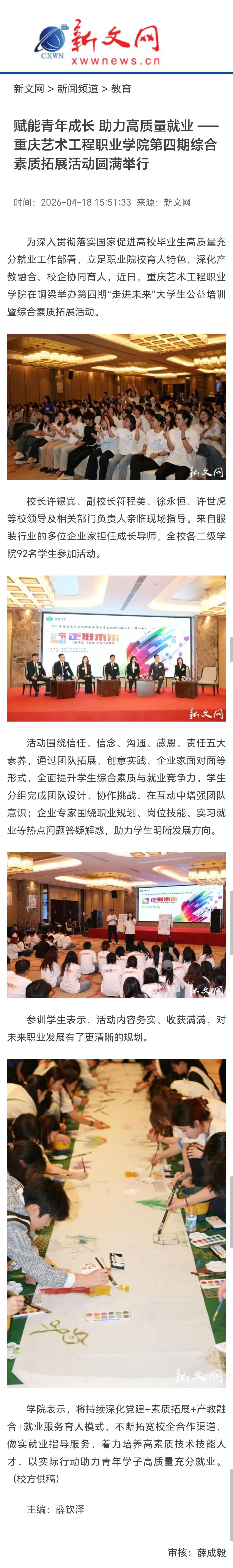 新文网:赋能青年成长 助力高质量就业 ——重庆艺术工程职业学院第四期综合素质拓展活动圆满举行 阅读:次 更新时间: 2026-04-20 摄影:| 编辑:liaobing 原文链接:https://www.xwwnews.cn/index/jiaoyu/show-11138.html 上一篇:今日头条:重庆艺术工程职业学院第四期综 合素质拓展活动圆满举行 下一篇:重庆广电第1眼新闻:党建领航强素质 校企融合促就业——重庆艺术工程职业学院第四期大学生就业引航计划圆满举办 分享到