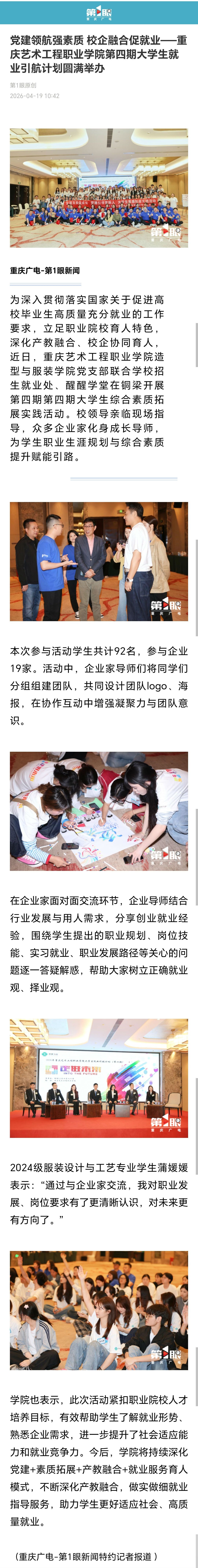 重庆广电第1眼新闻:党建领航强素质 校企融合促就业——重庆艺术工程职业学院第四期大学生就业引航计划圆满举办 阅读:次 更新时间: 2026-04-20 摄影:| 编辑:liaobing 原文链接:https://cqxyh5.cbgcloud.com/pages/details/details.html?companyId=cqtl&productId=066D48217FD742D0AEB37F6D0E9F6BC5&docid=833A65289E374B6898B52DBF2C80F659&isNew=yes&downloadTips=true 上一篇:新文网:赋能青年成长 助力高质量就业 ——重庆艺术工程职业学院第四期综合素质拓展活动圆满举行 下一篇:最后一页 分享到